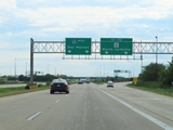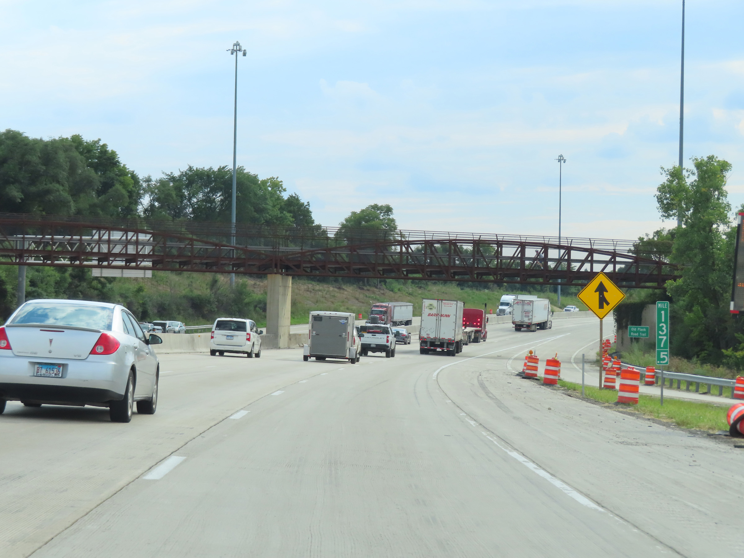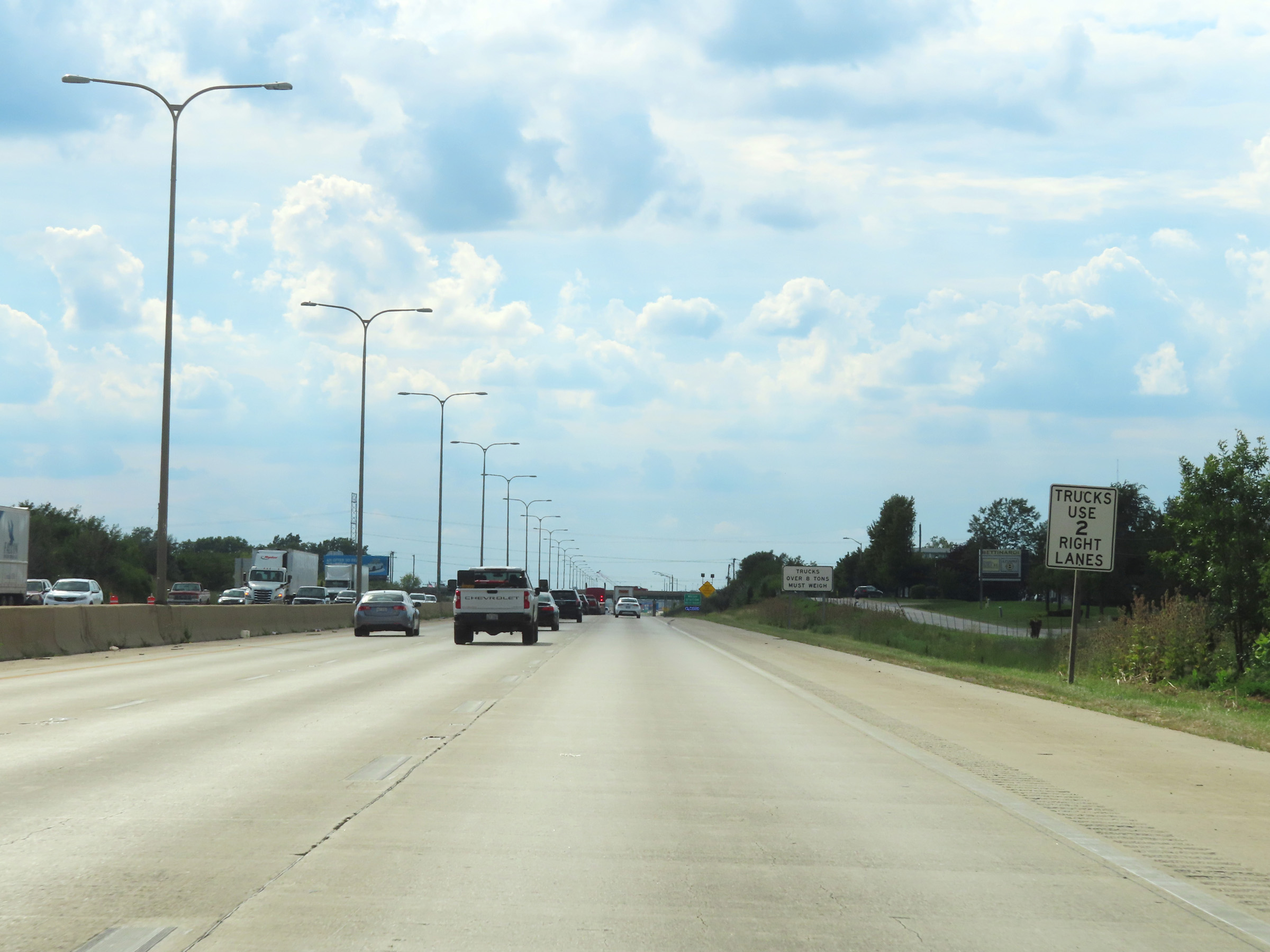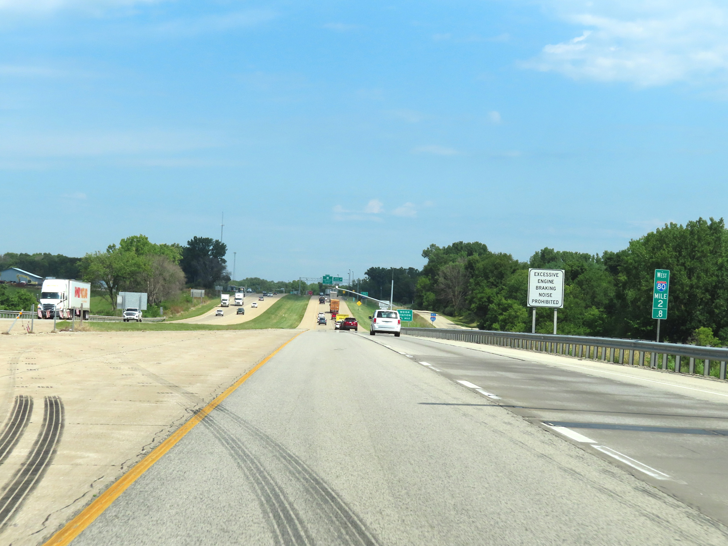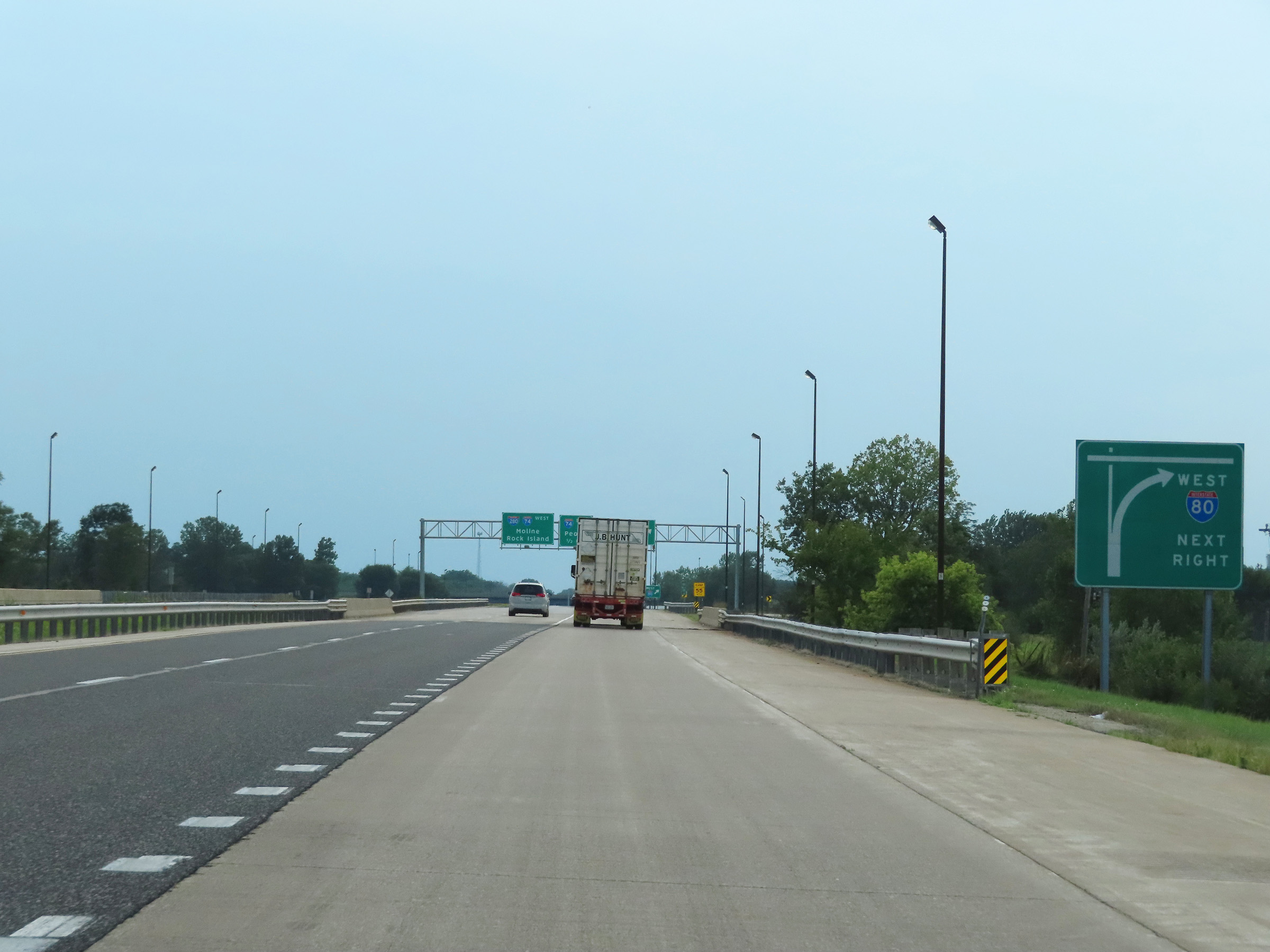 Interstate 80 West at its junction with Interstate 74 / Interstate 280 West, at mile marker 10.6. I-74 and I-280 West traffic should remain straight ahead, while I-80 West traffic must exit to the right here at mile marker 10.6. (Photo taken 8/19/22). |