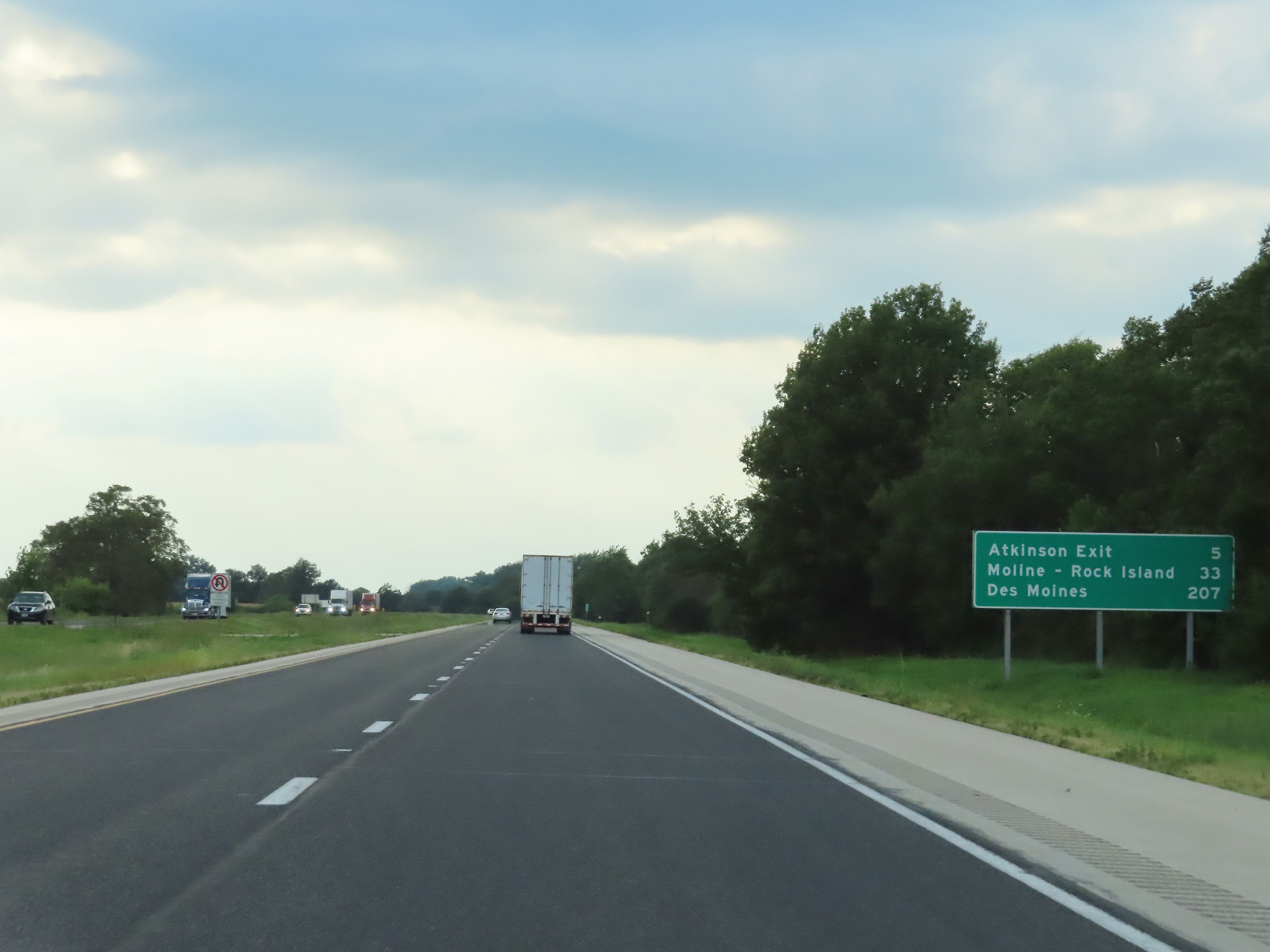 Mileage sign on Interstate 80 West. It's 5 miles to the Atkinson Exit, 33 miles to Moline-Rock Island, and 207 miles to Des Moines. (Photo taken 8/19/22). |