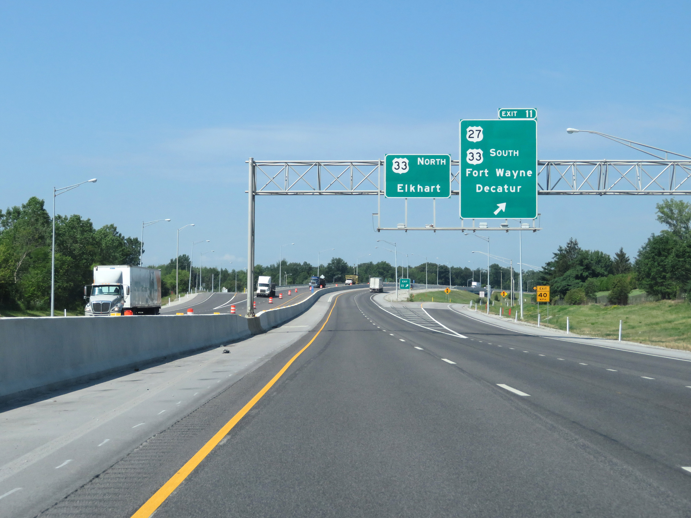 Interstate 469 Inner Loop (South) at Exit 11: US 27 / US 33 South - Fort Wayne / Decatur (Photo taken 7/19/17). |