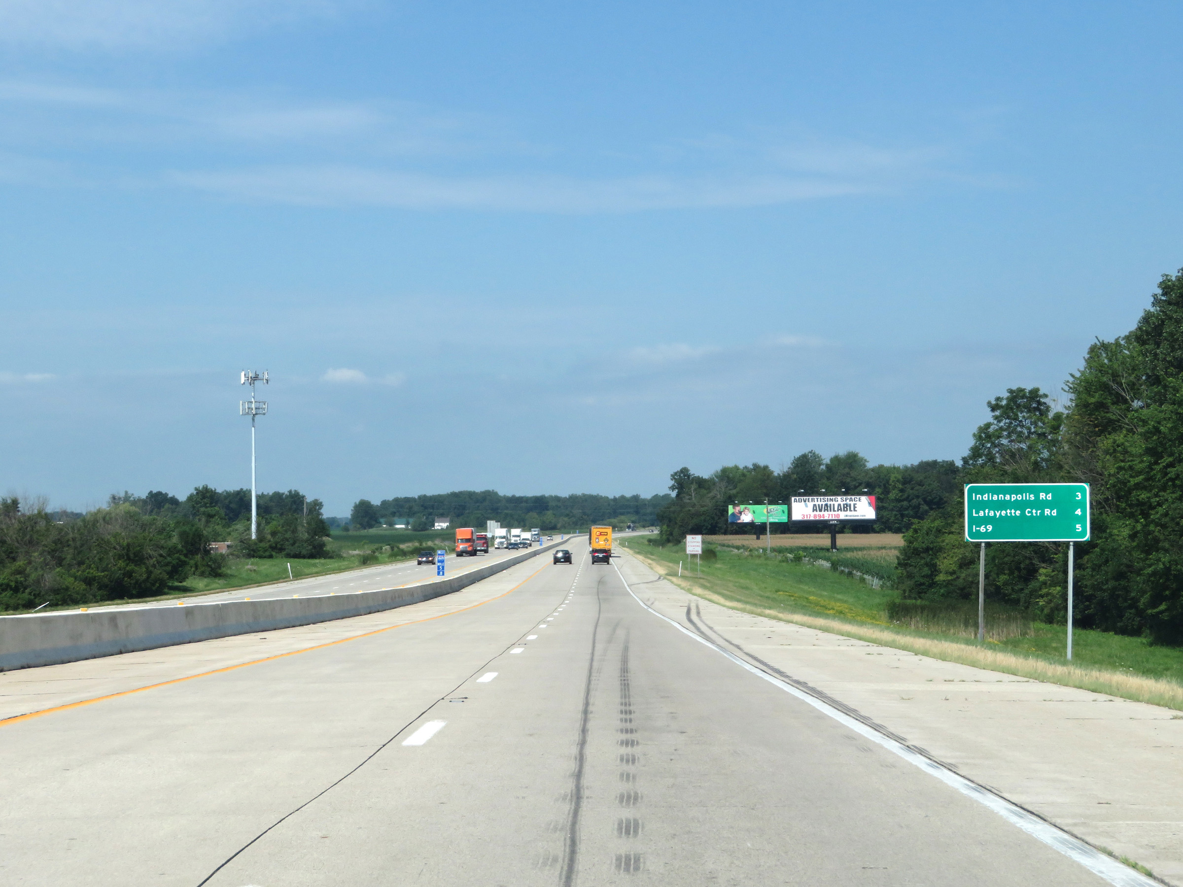 Interstate 469 Inner Loop (West) at Exit 0A: Interstate 69 South - Indianapolis. The two thru lanes of I-469 Inner Loop (West) will continue as Lafayette Center Rd West as I-469 reaches its southern/western terminus. (Photo taken 7/19/17). |