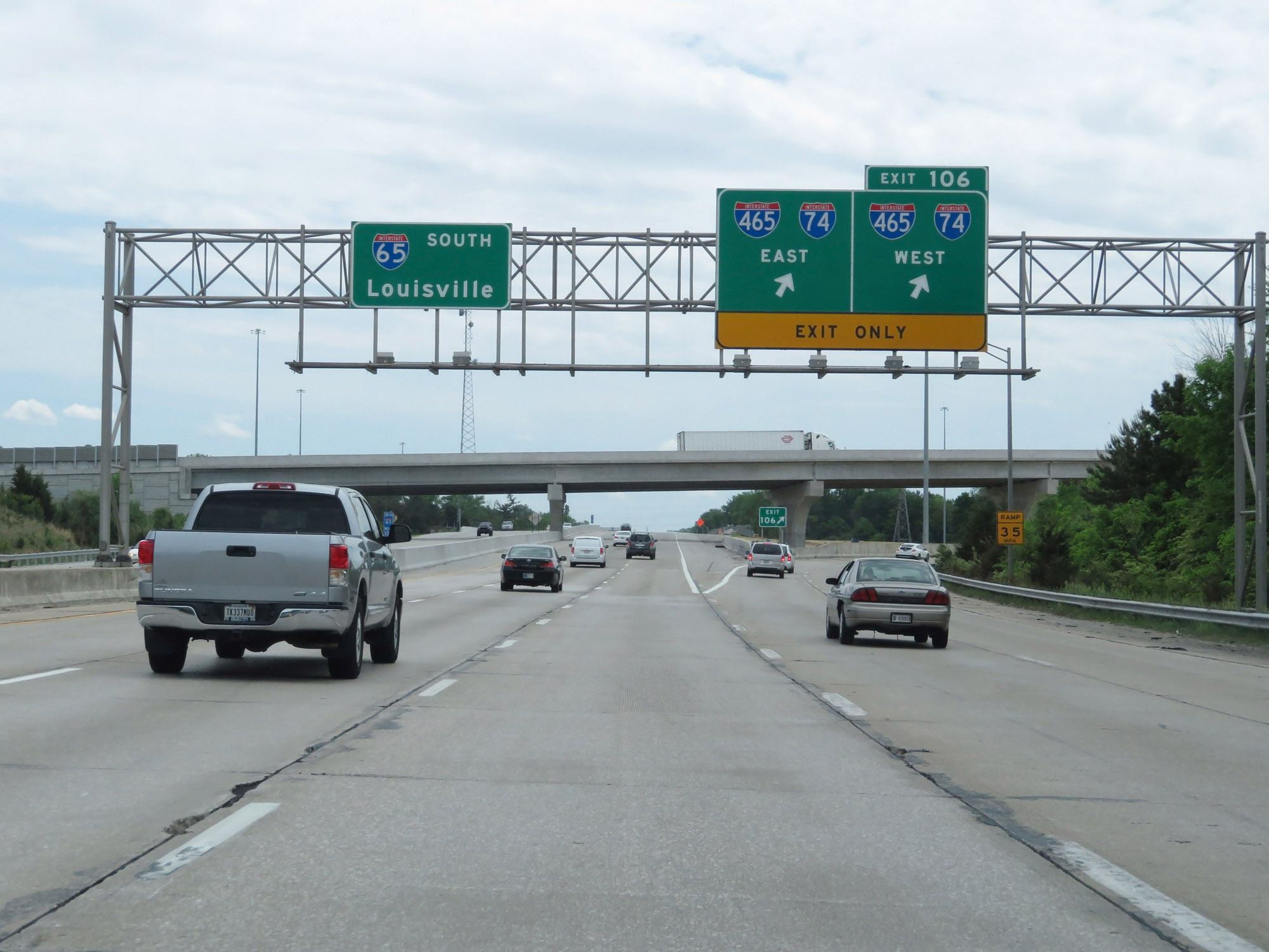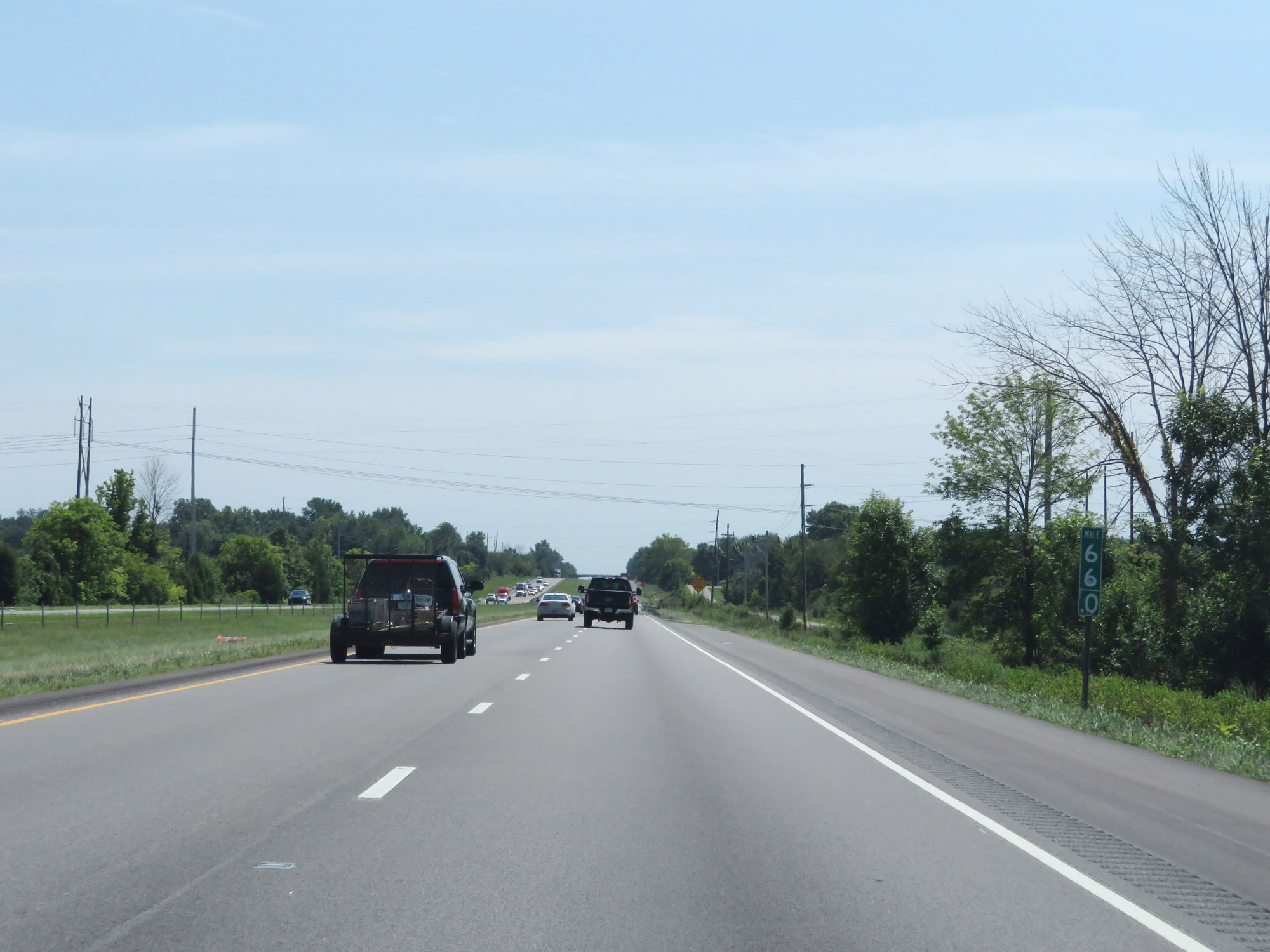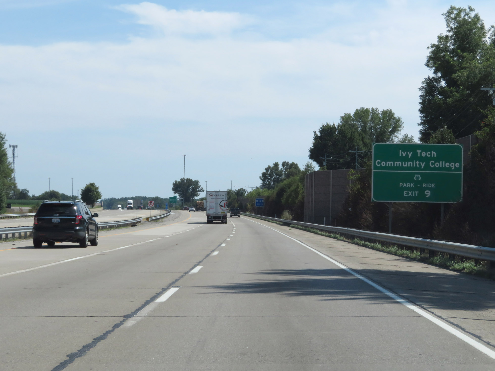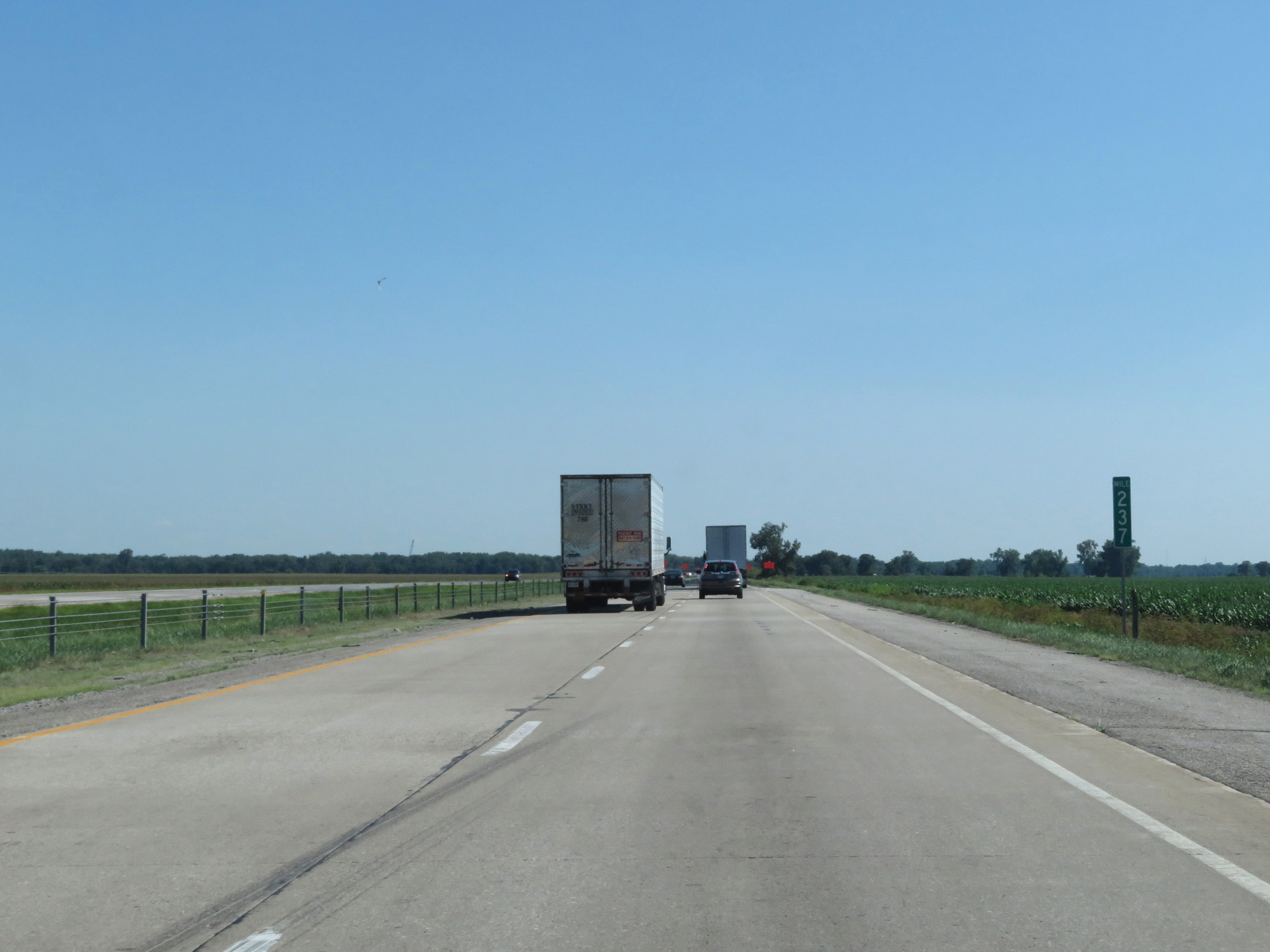 South of Exit 253, the speed limit increases to 70 mph for cars and 65 mph for trucks. These are the standard speed limits on most rural Interstate highways in Indiana. (Photo taken 7/18/17). |