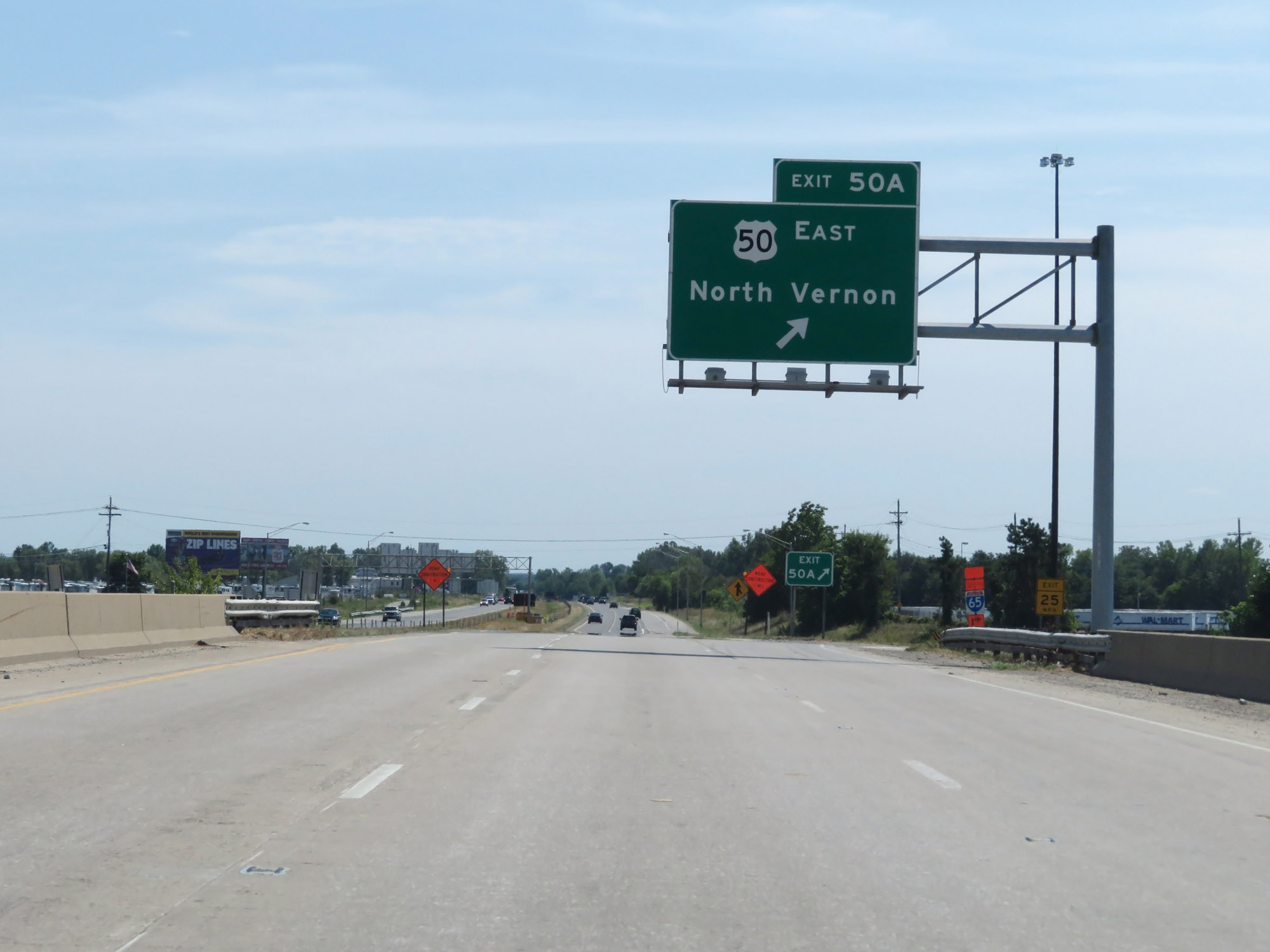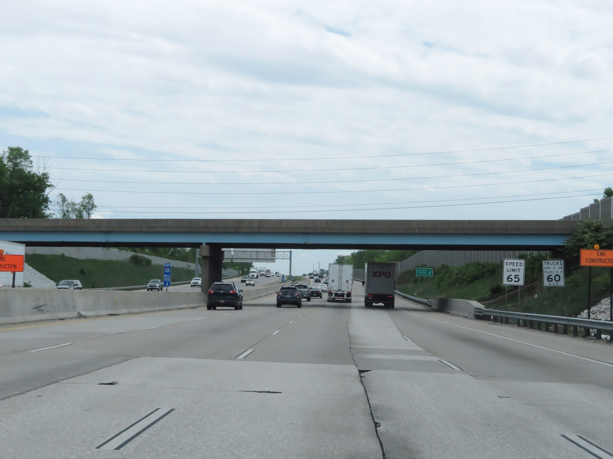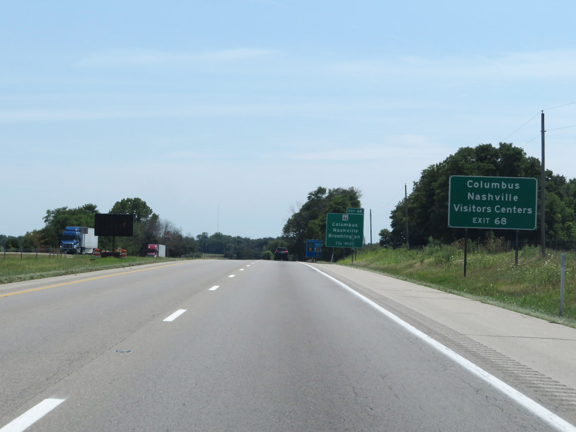 South of Exit 253, the speed limit increases to 70 mph for cars and 65 mph for trucks. These are the standard speed limits on most rural Interstate highways in Indiana. (Photo taken 7/18/17). |