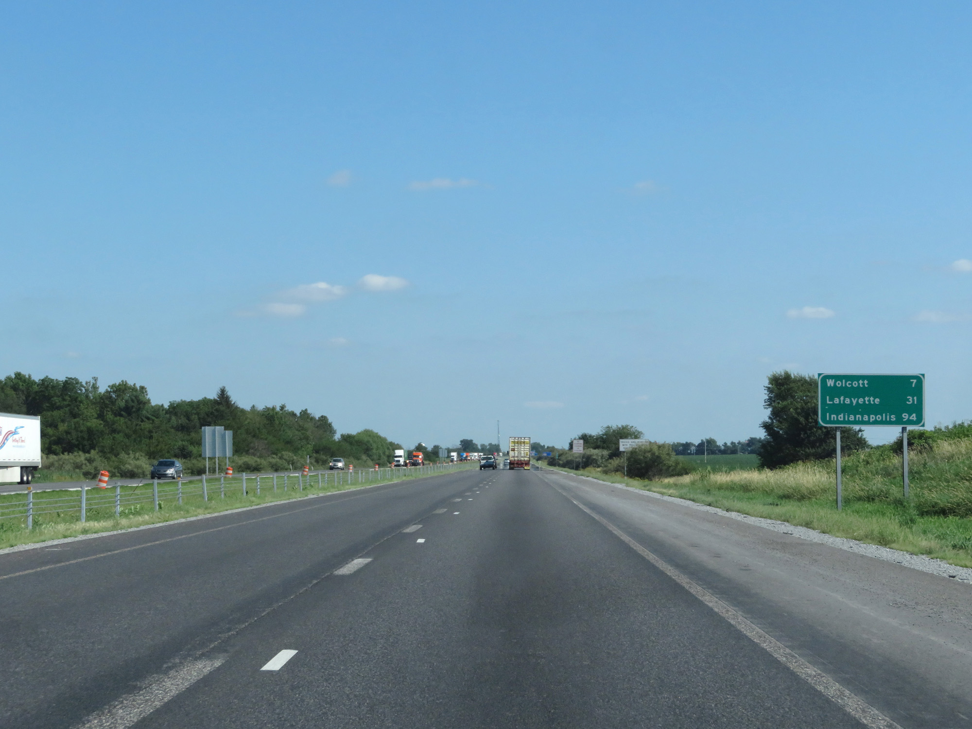 Mileage sign on Interstate 65 South. It's 7 miles to Wolcott, 31 miles to Lafayette, and 94 miles to Indianapolis. (Photo taken 7/18/17). |