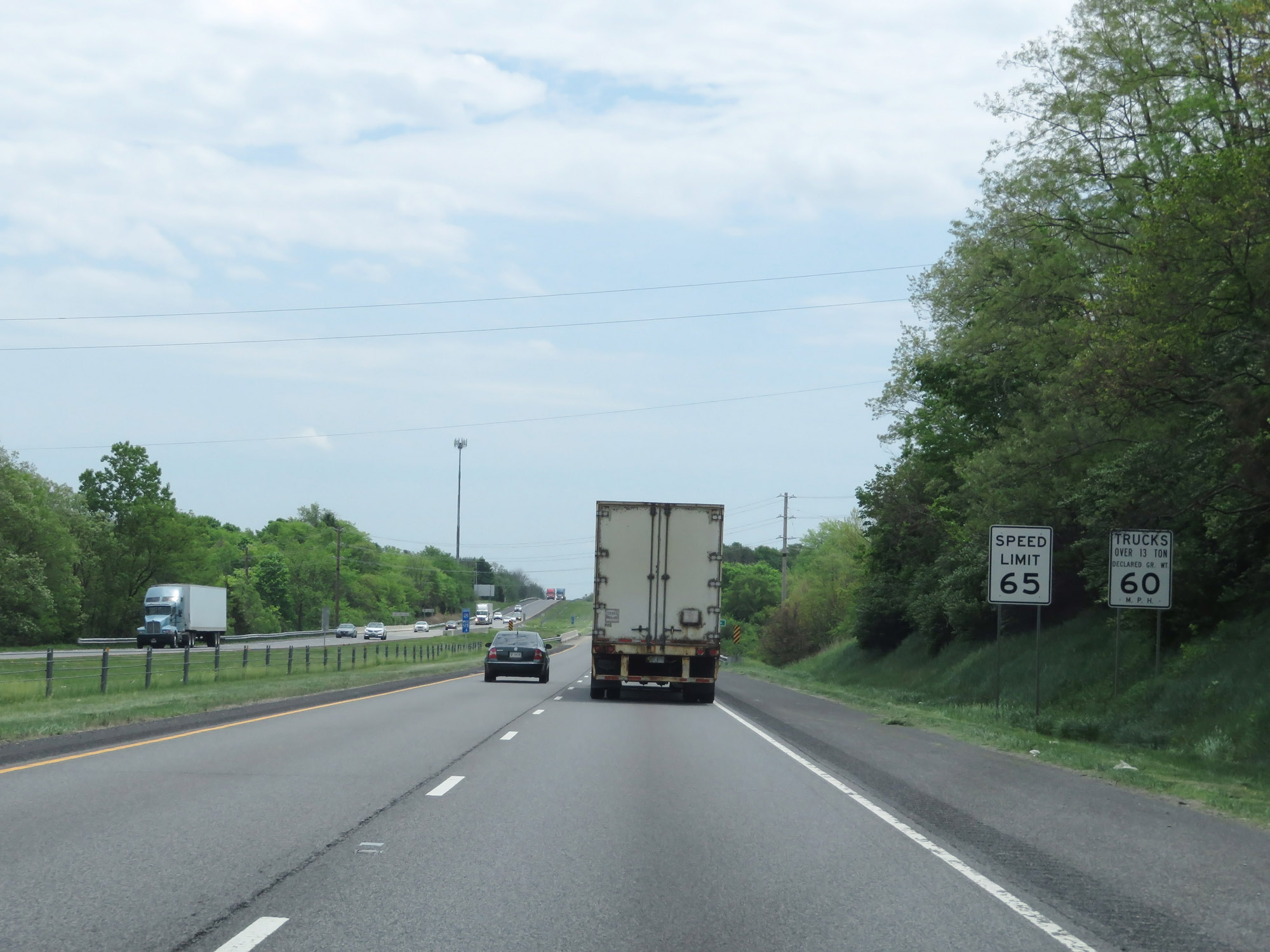 Approaching the Lafayette area, the speed limits decrease to 65 mph for cars and 60 mph for trucks. (Photo taken 7/18/17). |