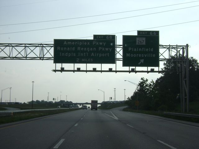 Interstate 70 East at Exit 68: Ameriplex Pkwy / Ronald Reagan Pkwy / Indianapolis International Airport (Photo taken 5/24/10). |