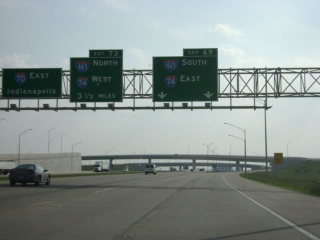Interstate 70 East at Exit 69: Interstate 465 South / Interstate 74 East (Photo taken 5/24/10). |