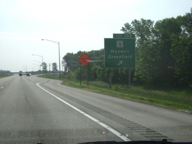 Interstate 70 East at Exit 104: IN 9 - Maxwell / Greenfield (Photo taken 5/24/10). |