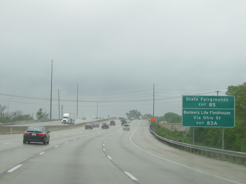 Take Exit 85 to the State Fairgrounds. Take Exit 83A to Bankers Life Fieldhouse via Ohio St. (Photo taken 5/16/15).