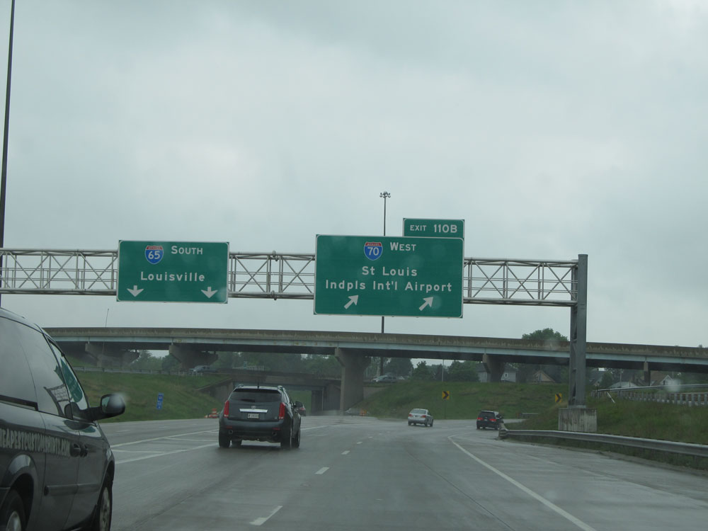 Interstate 70 West / Interstate 65 South at Exit 110B: Interstate 70 West - St Louis / Indianapolis International Airport (Photo taken 5/16/15).