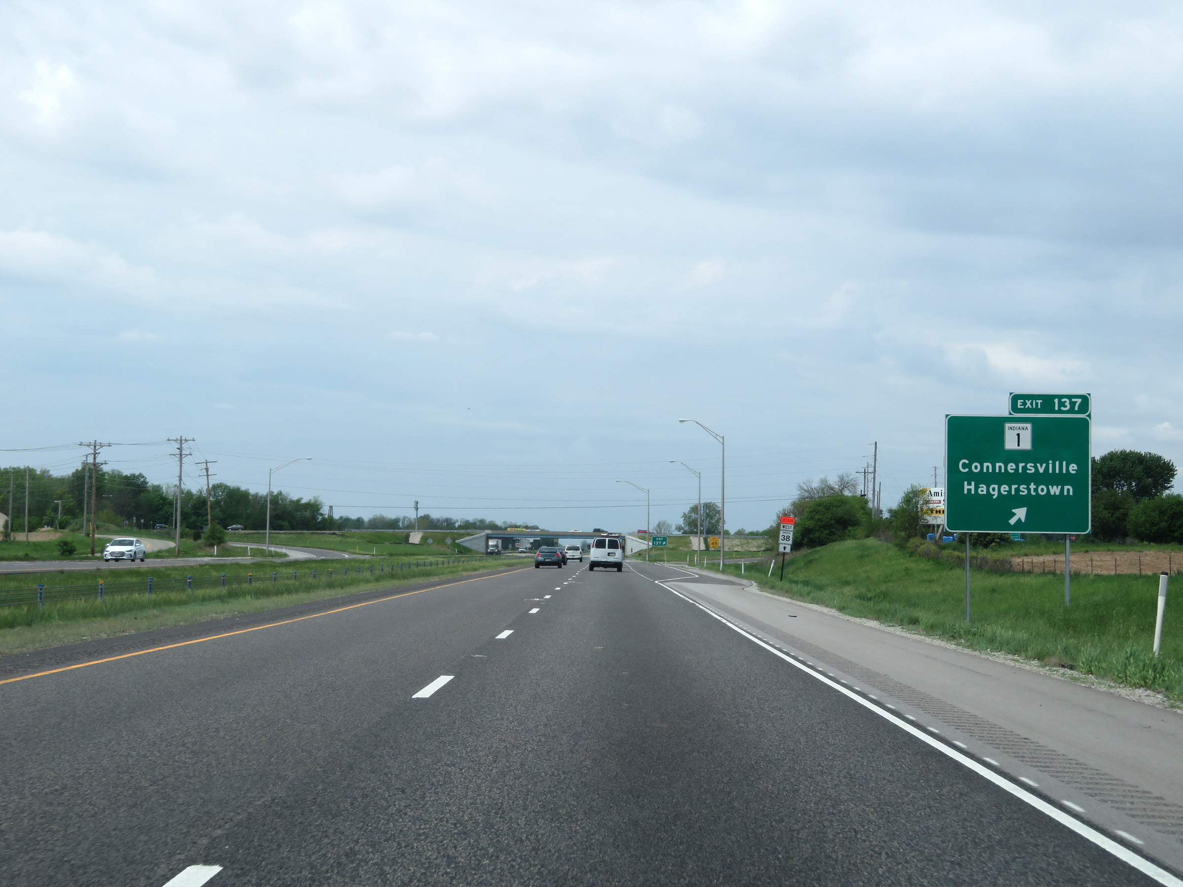 Interstate 70 West at Exit 137: IN 1 - Connersville / Hagerstown (Photo taken 5/15/18). |