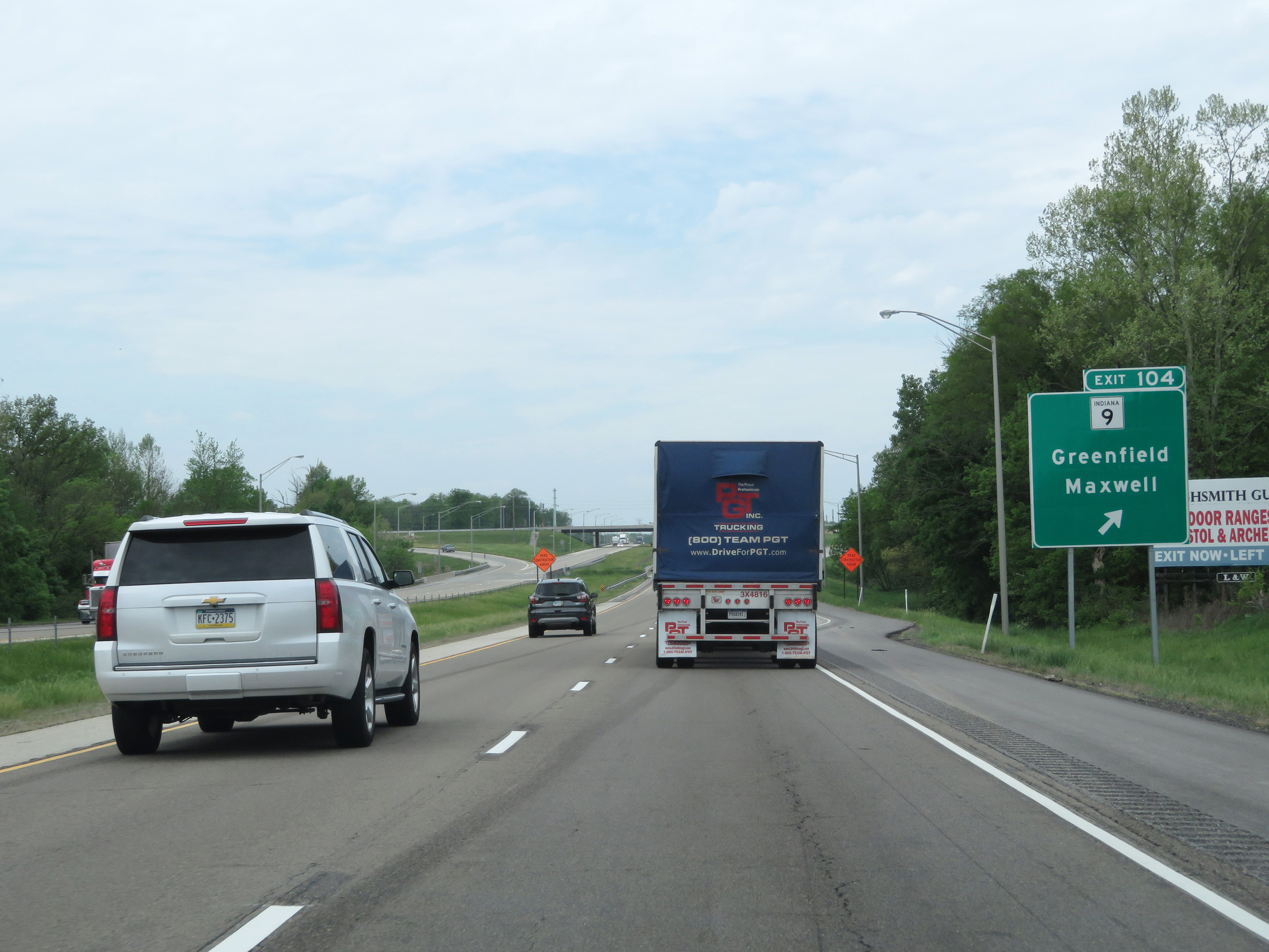 Interstate 70 West at Exit 104: IN 9 - Greenfield / Maxwell (Photo taken 5/15/18). |