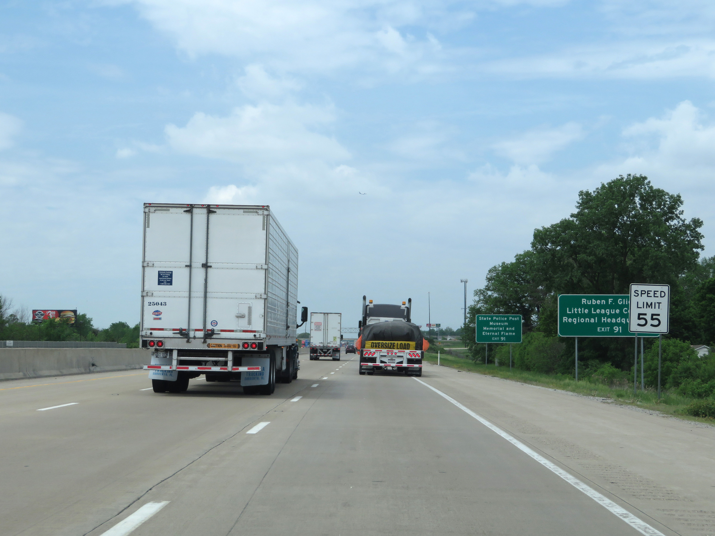Approaching Exit 91, the speed limit decreases to 55 mph on Interstate 70 West. (Photo taken 5/15/18). |