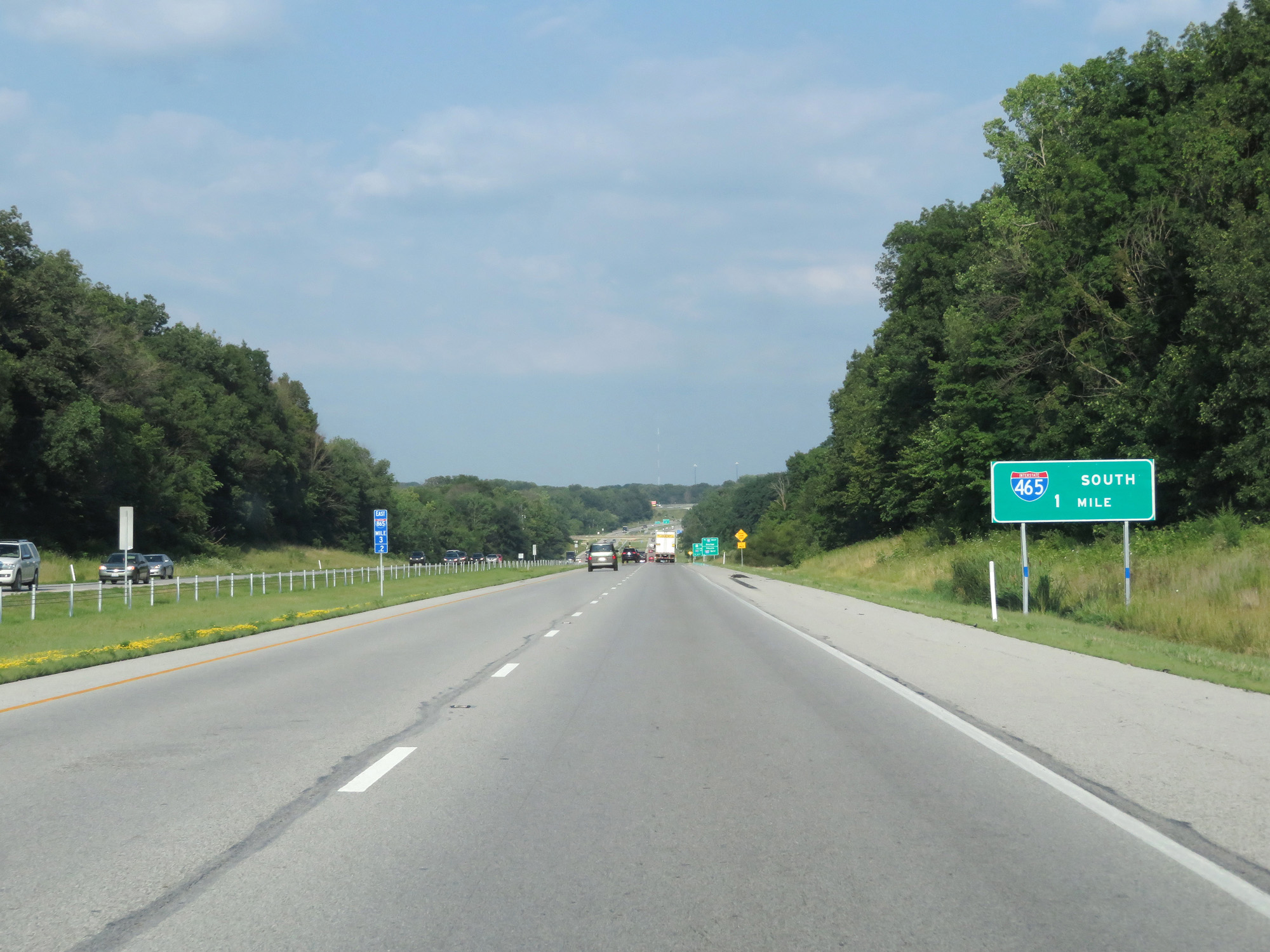 Interstate 865 East approaching the ramp to Interstate 465 South (Outer Loop) - 1 mile. (Photo taken 7/18/17). |
