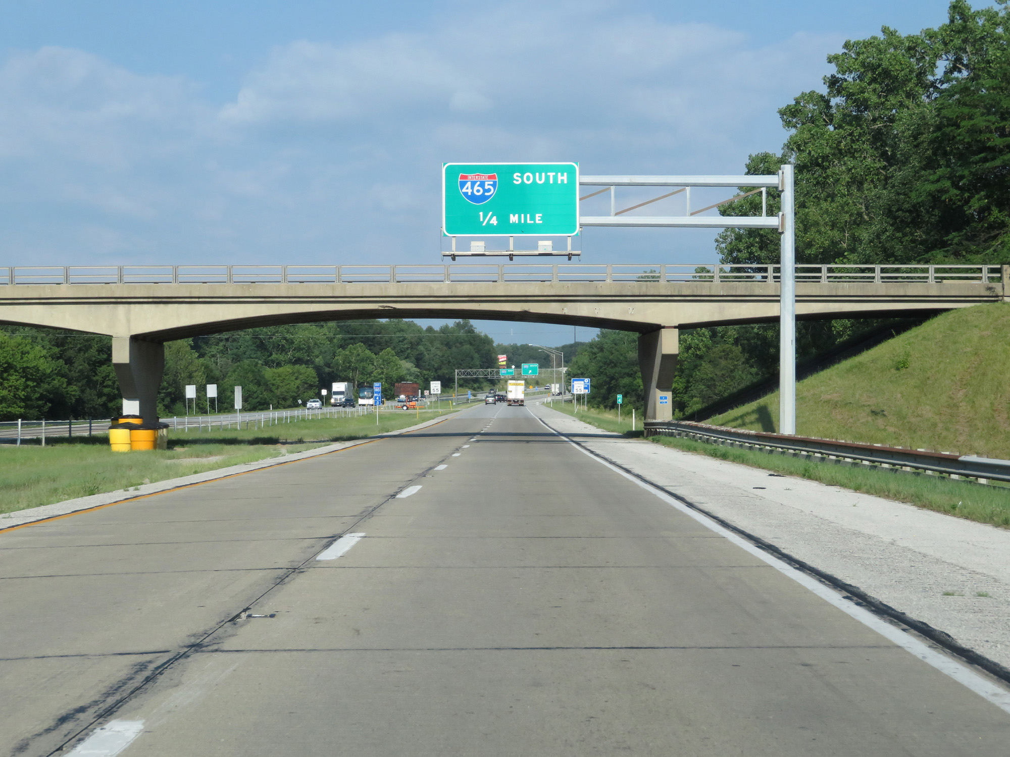 Interstate 865 East approaching the ramp to Interstate 465 South (Outer Loop) - 1/4 mile. (Photo taken 7/18/17). |