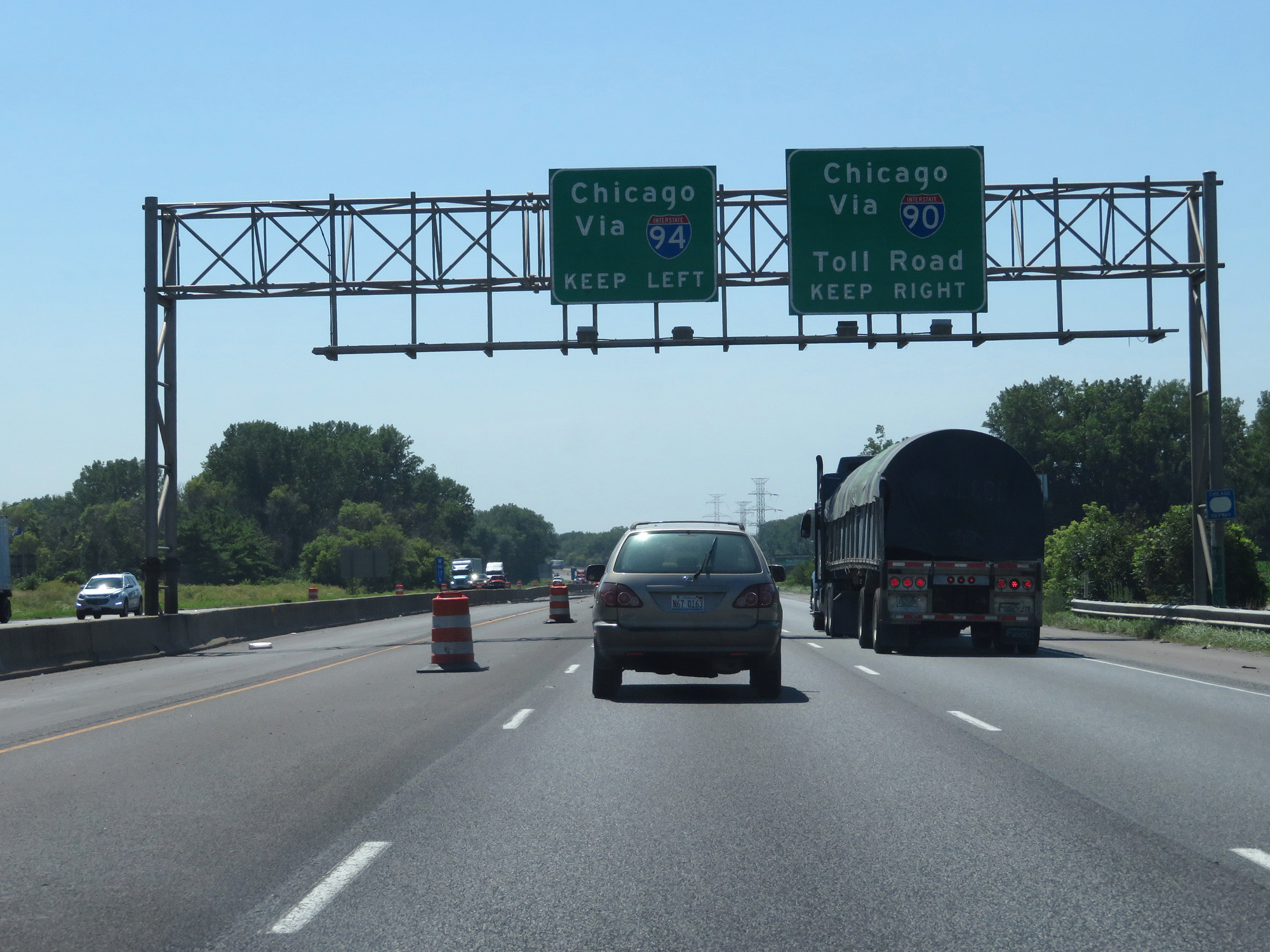 Traffic headed to Chicago via Interstate 90 West (Indiana Toll Road) should keep right. Traffic headed to Chicago via Interstate 94 West should keep left. (Photo taken 7/18/17). |
