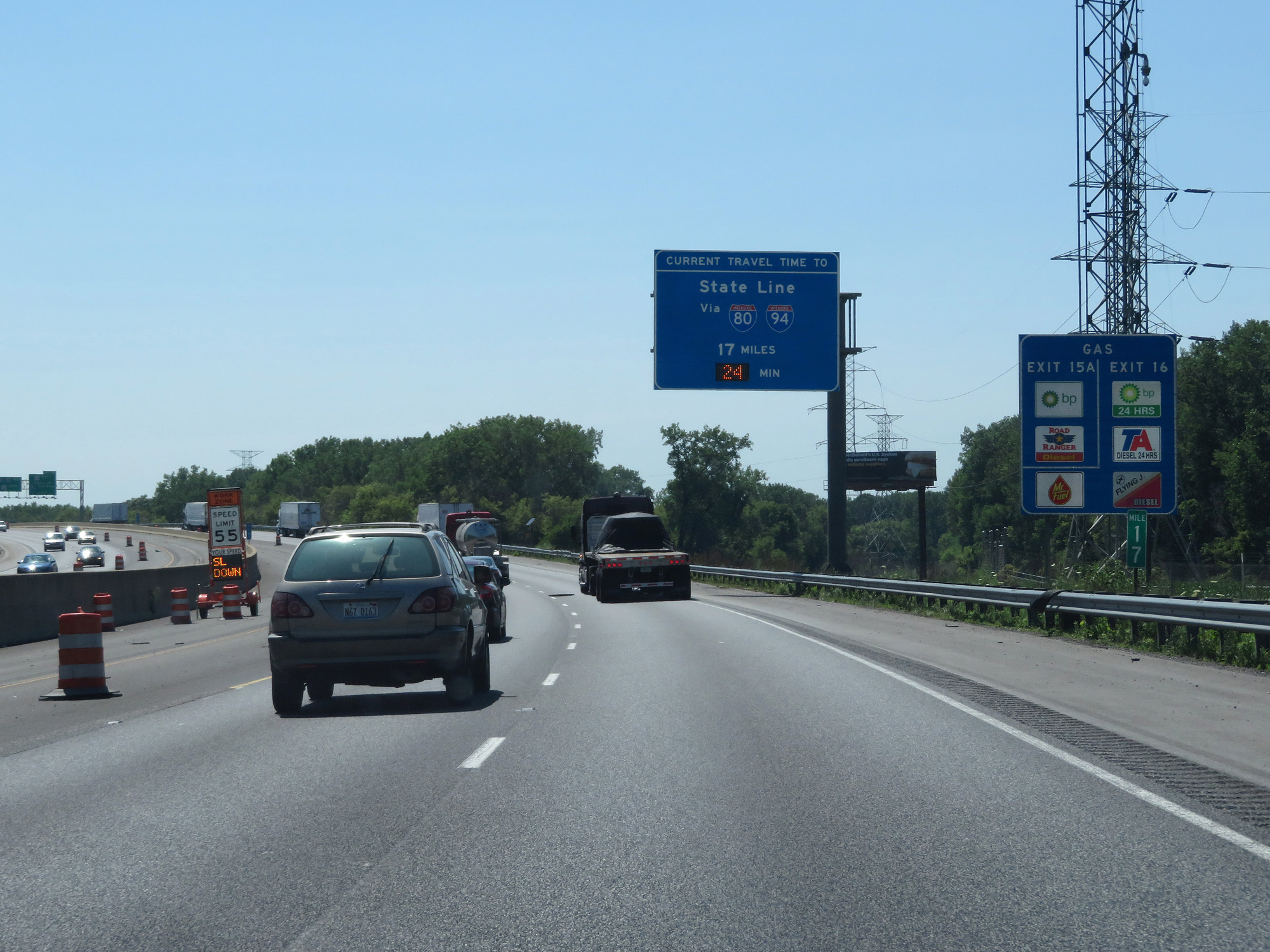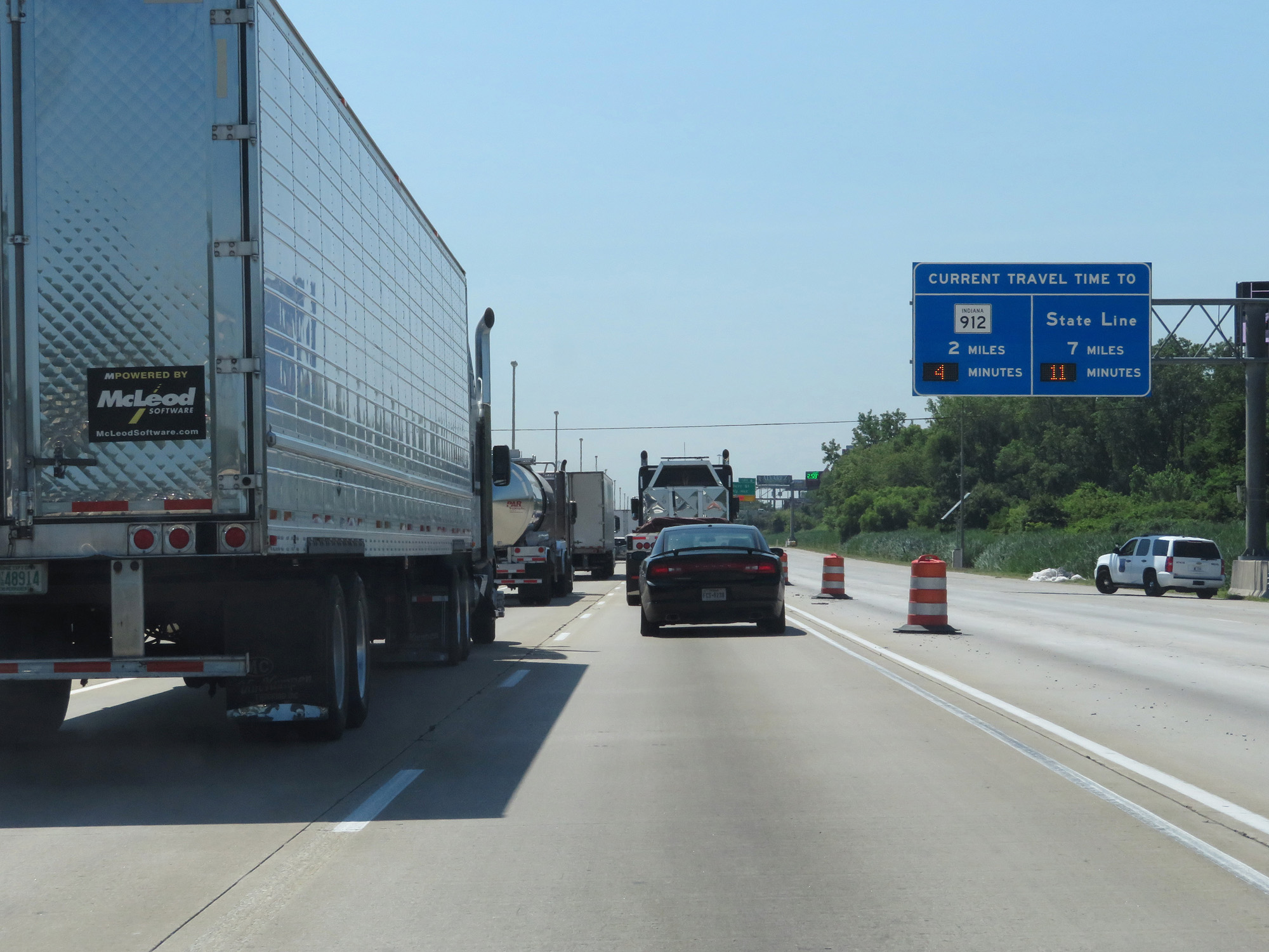 Digital overhead travel time sign listing the distance and current travel time to the IN 912 interchange and the Illinois border. As you can see, there were some delays at the time. (Photo taken 7/18/17). |