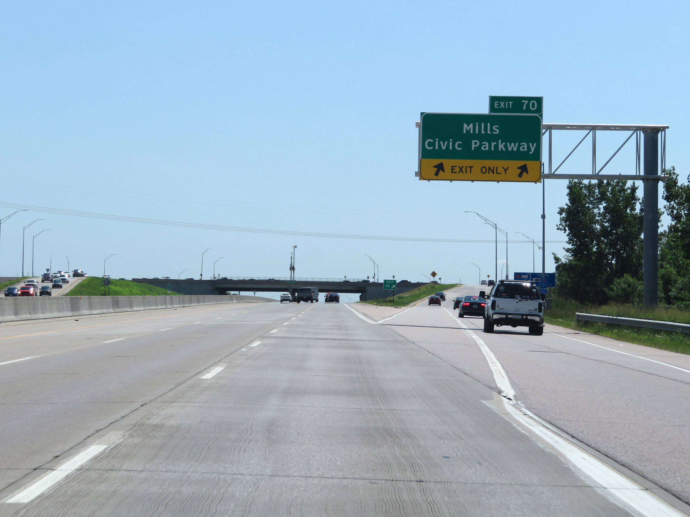Interstate 35 South at Exit 70: Mills Civic Parkway (Photo taken 8/8/20). |