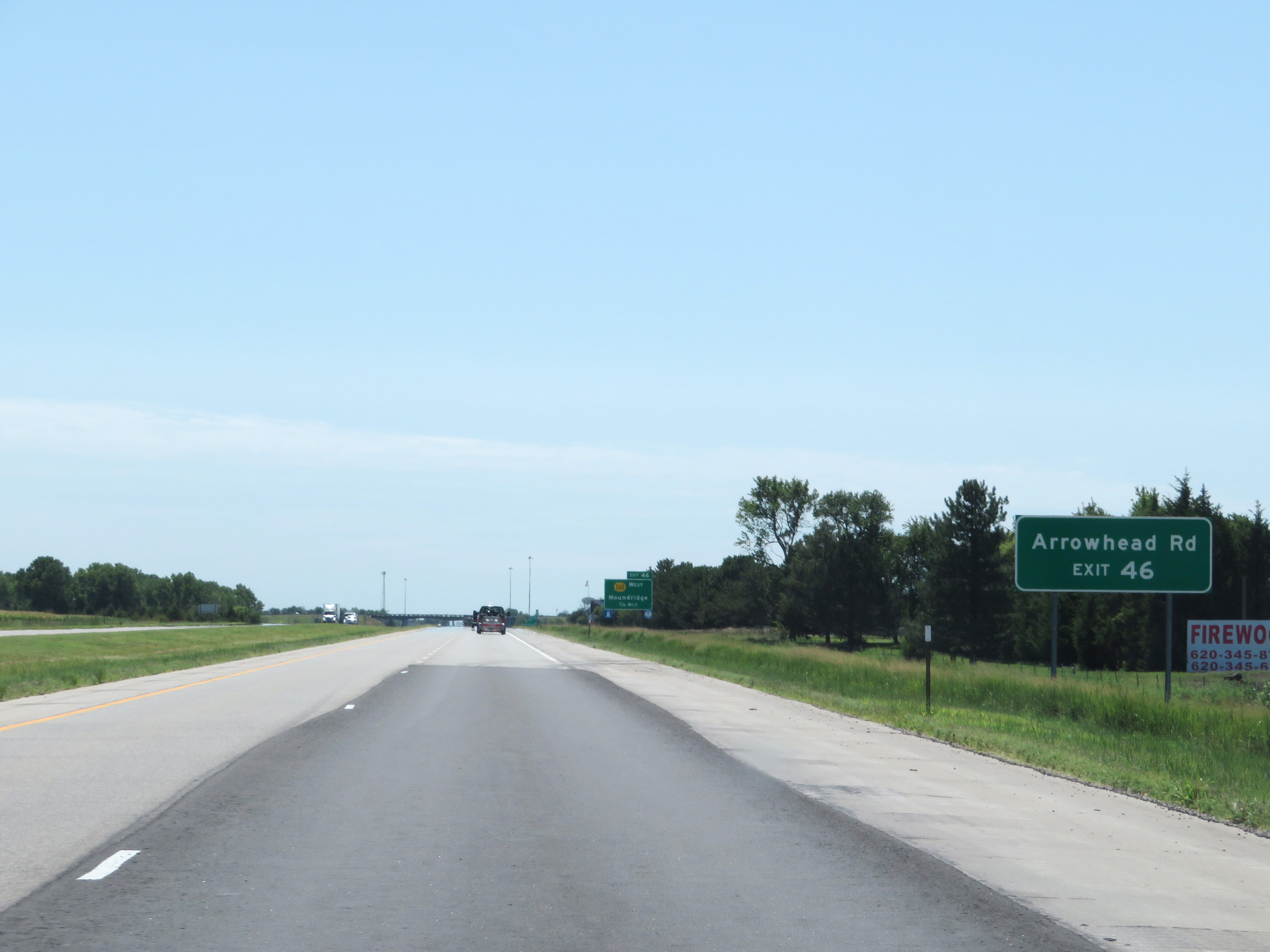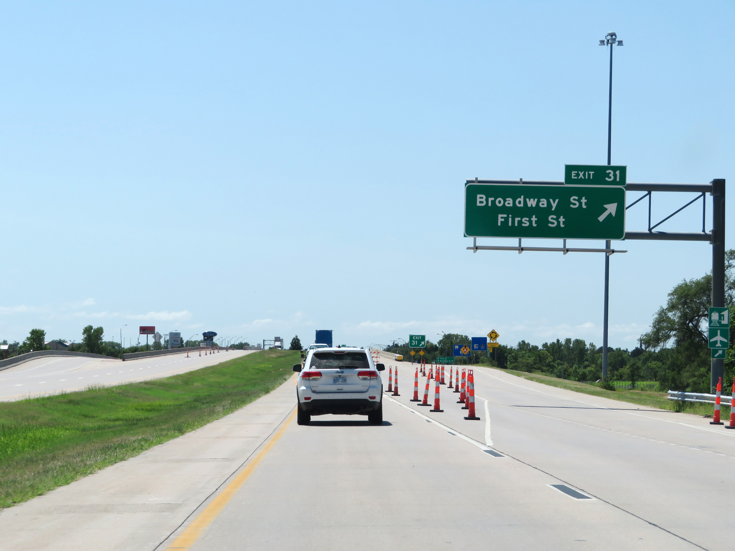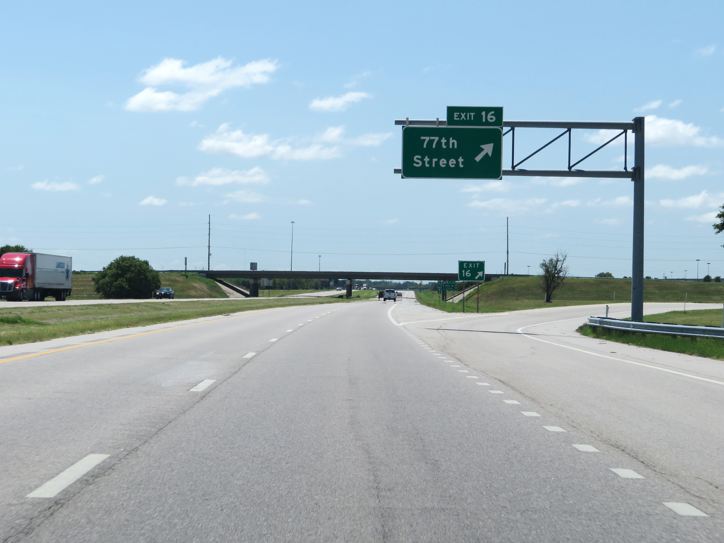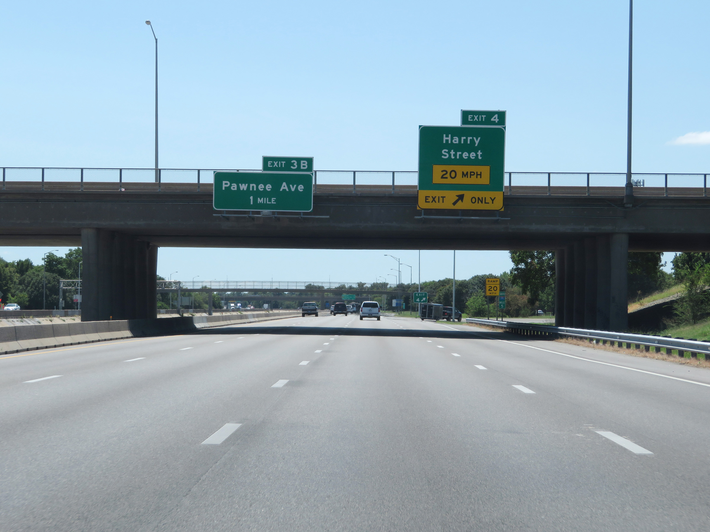 Interstate 135 South at Exit 65: Pawnee Road (Photo taken 8/11/20). |