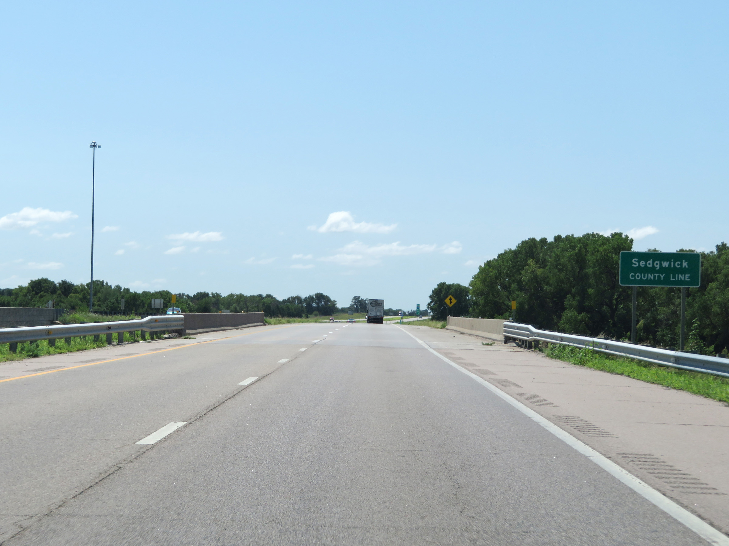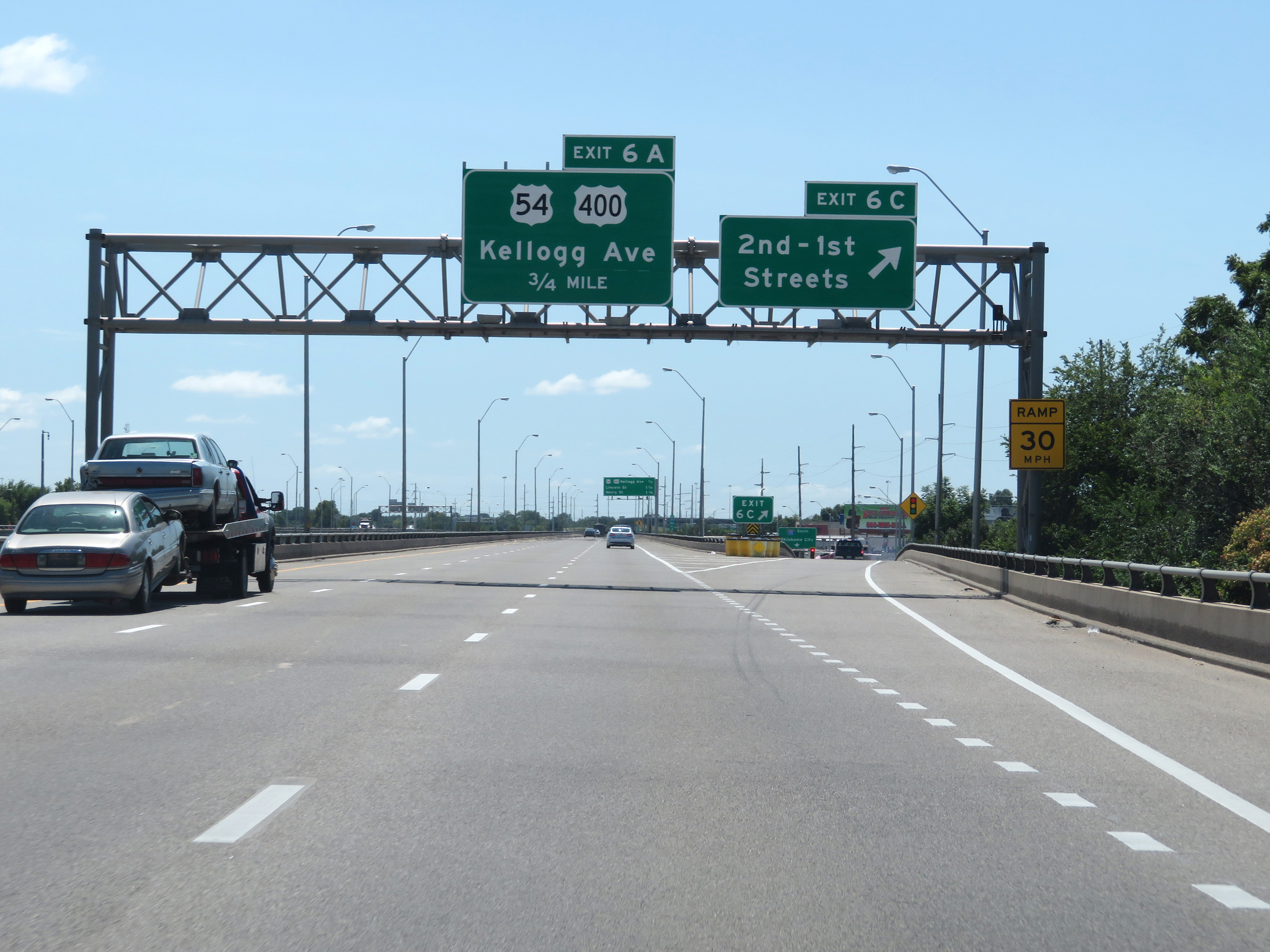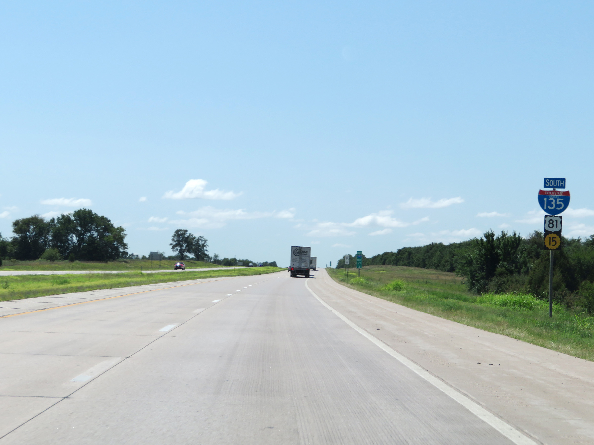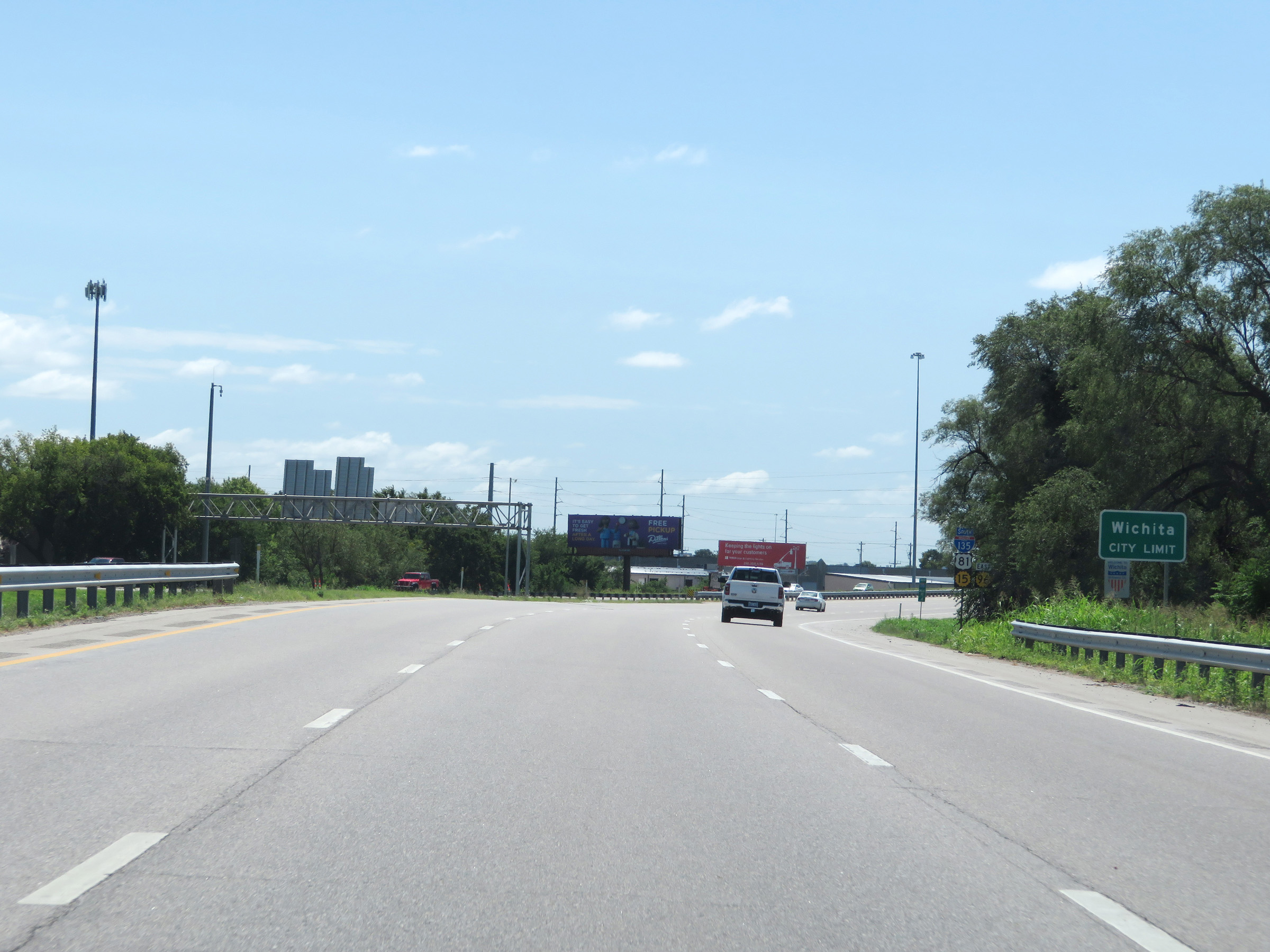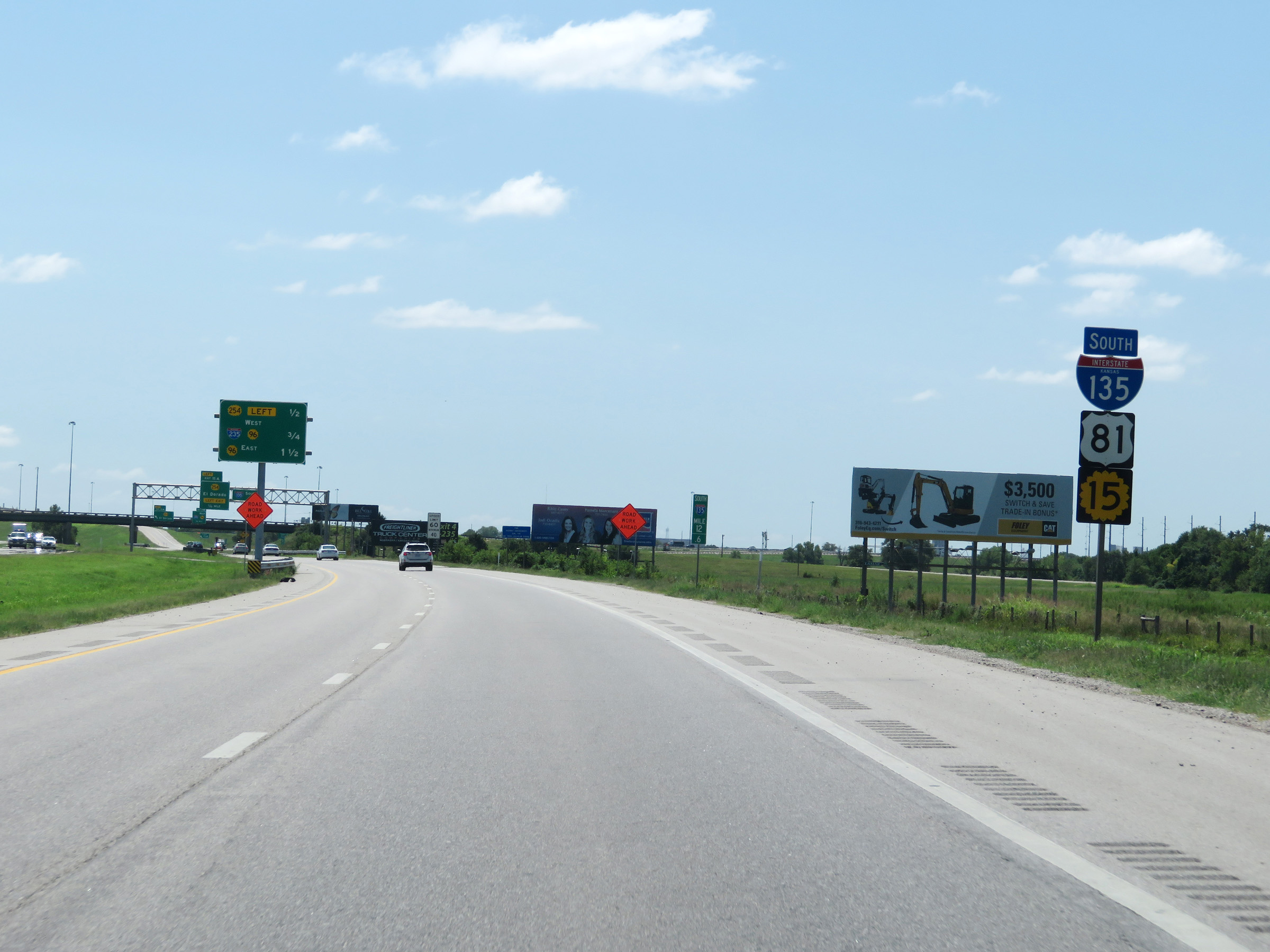 US 81 South as it approaches the beginning of Interstate 135 South, which will occur 1/2 mile ahead at the junction of Interstate 70. (Photo taken 8/11/20). |