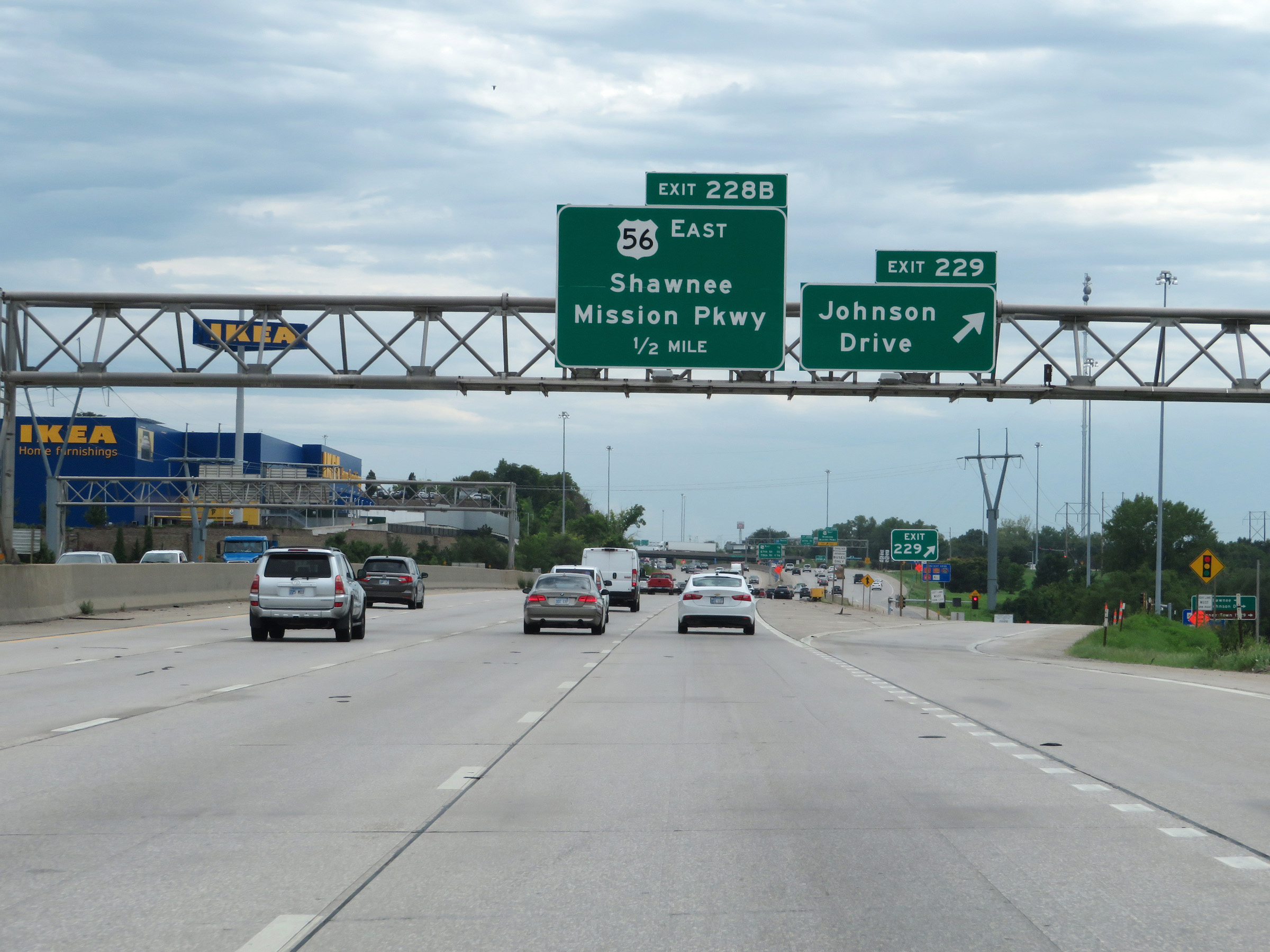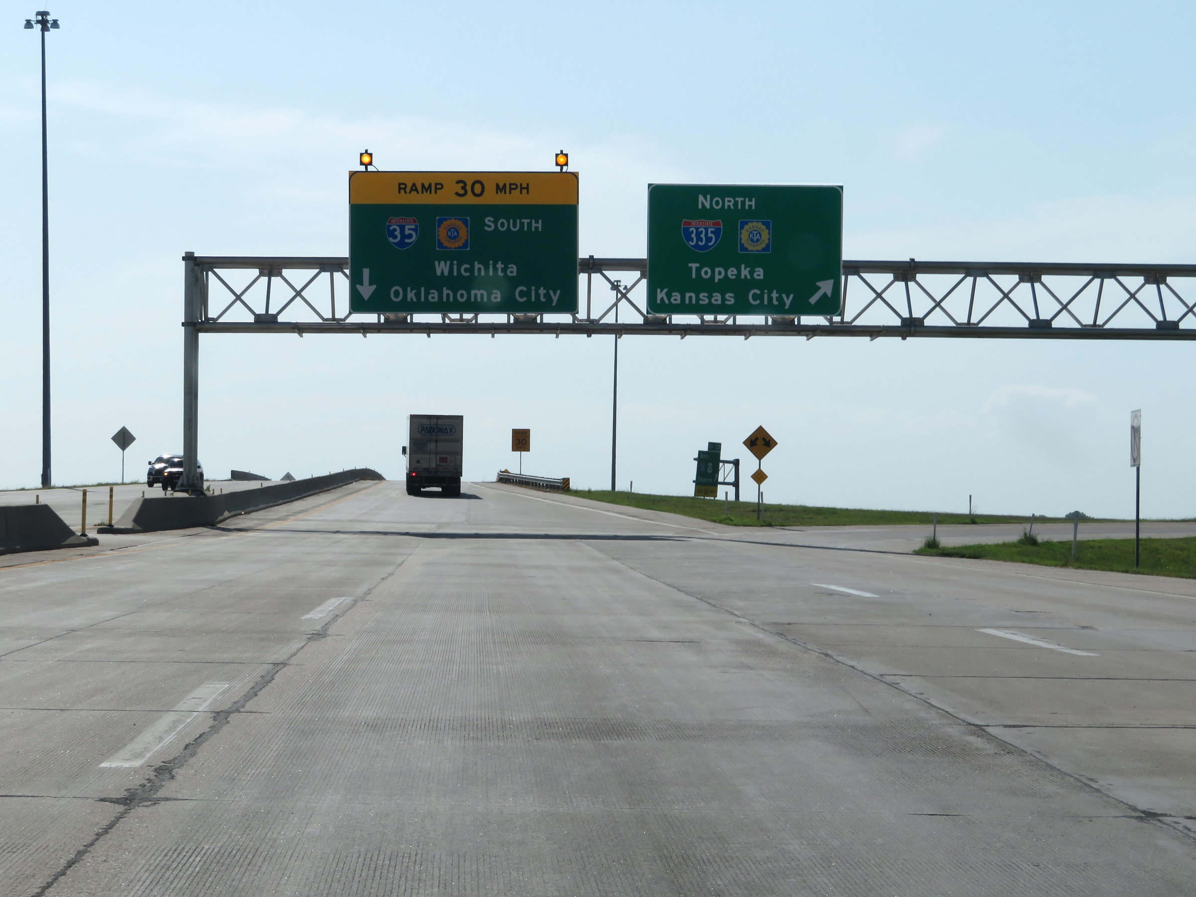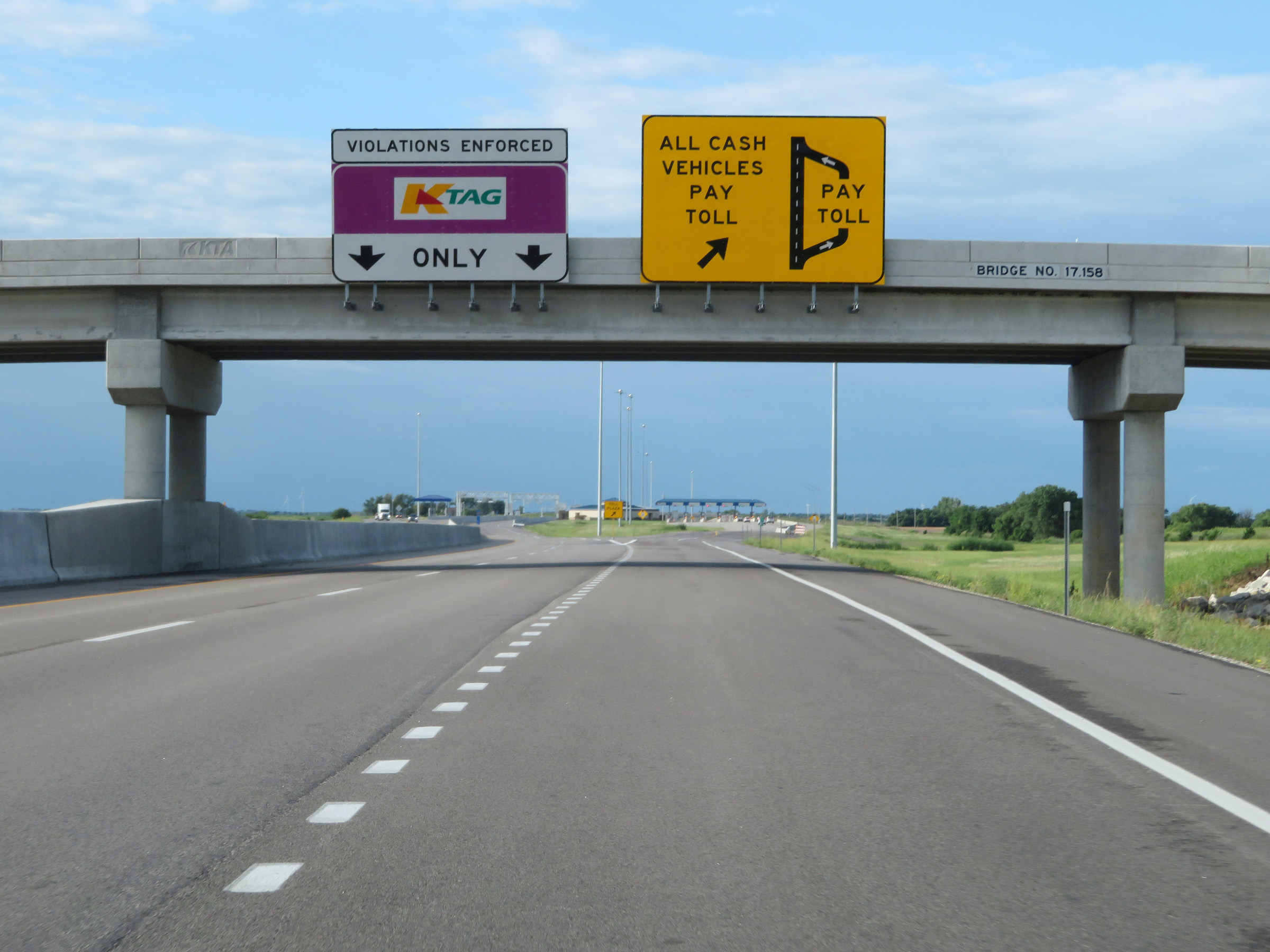 Leaving the toll plaza, Interstate 35 South traffic should stay straight ahead. Traffic to Interstate 335 North toward Topeka must exit to the right here. (Photo taken 8/10/20). |