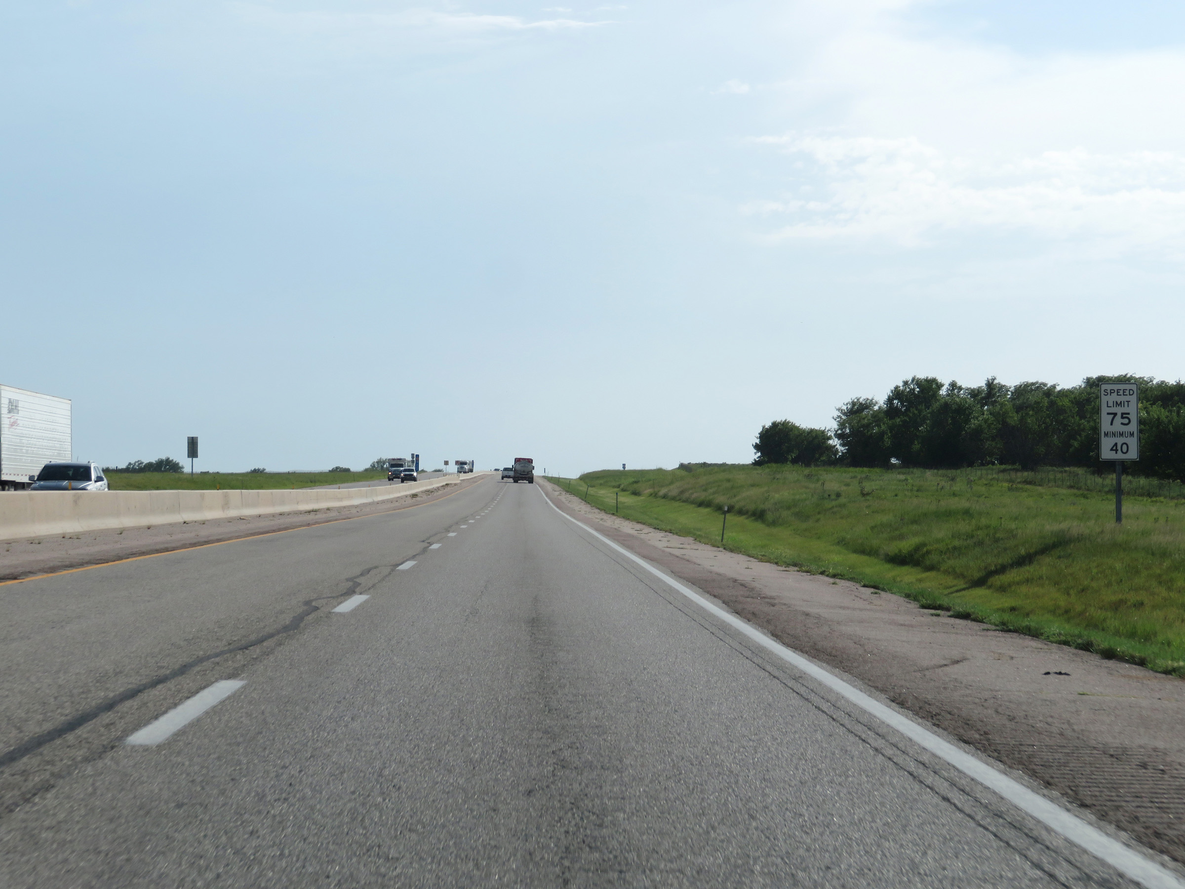 The speed limits on Interstate 35 South (Kansas Turnpike) remain 75 mph maximum and 40 mph minimum. These are the standard speed limits on most rural Interstate highways in Kansas. (Photo taken 8/10/20). |