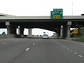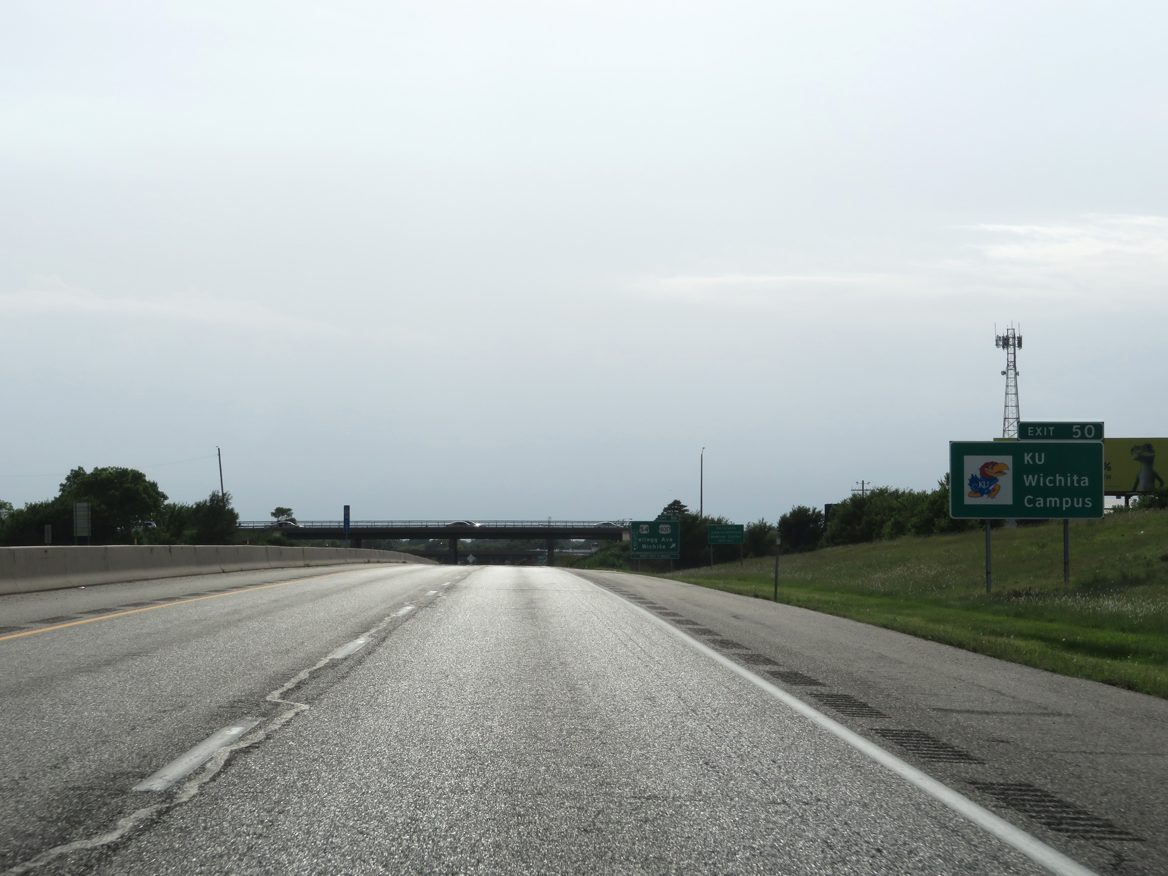 View on the ramp on Interstate 35 South to the Kansas Turnpike as it curves hard to the left. (Photo taken 8/10/20). |