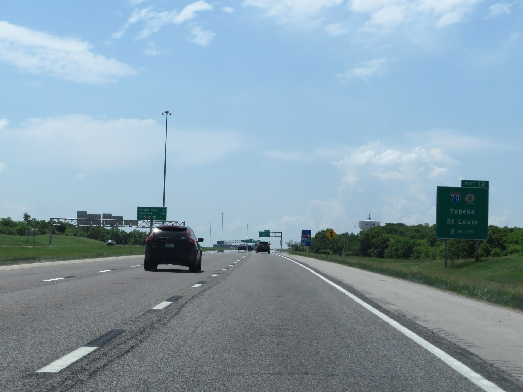 Interstate 435 Outer Loop (South) at Exit 12: Interstate 70 / Kansas Turnpike / US 24 / US 40 - Topeka / St Louis (Photo taken 5/17/18). |