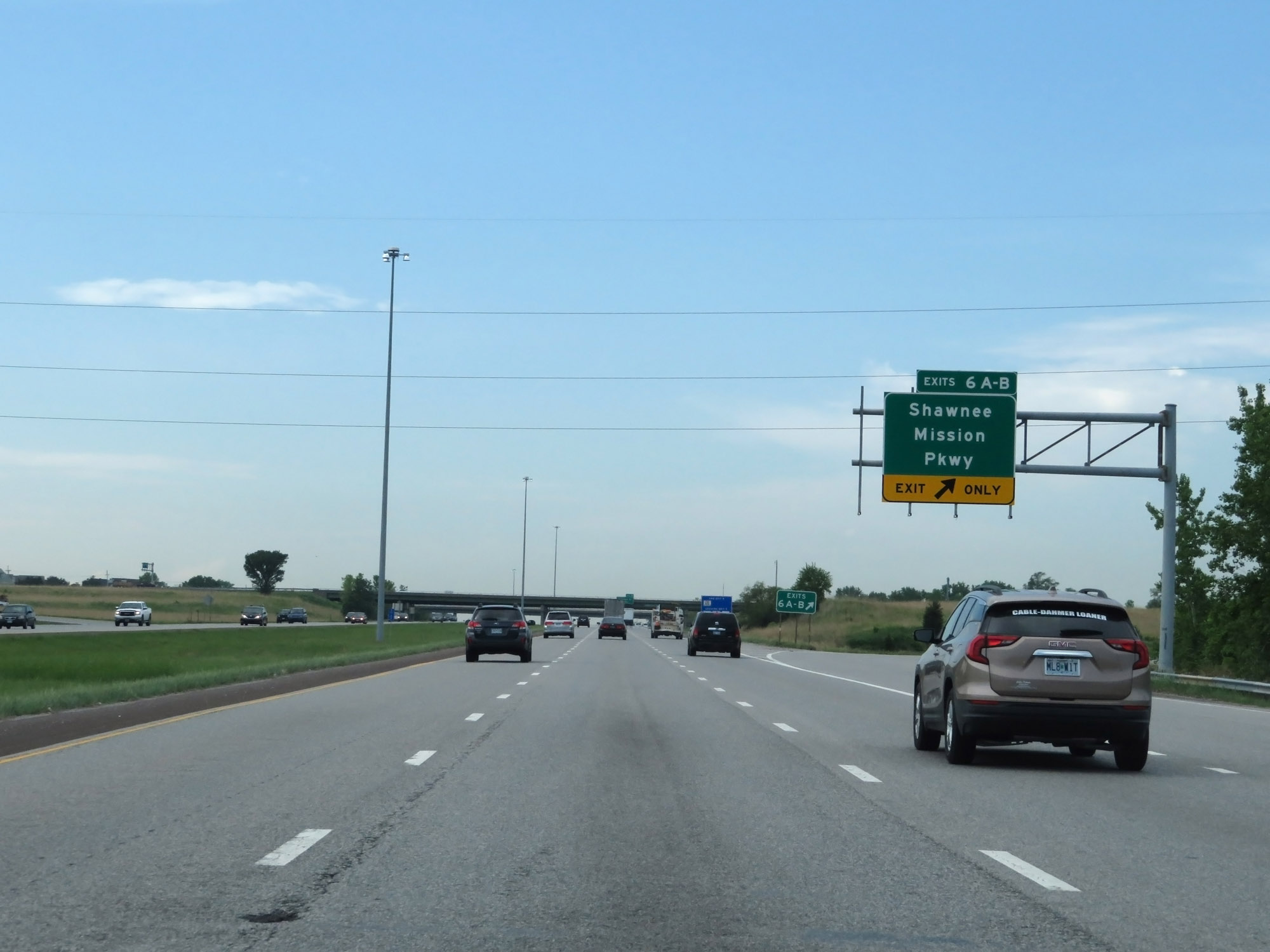 Interstate 435 Outer Loop (South) at Exits 6A-B: Shawnee Mission Pkwy (Photo taken 5/17/18). |