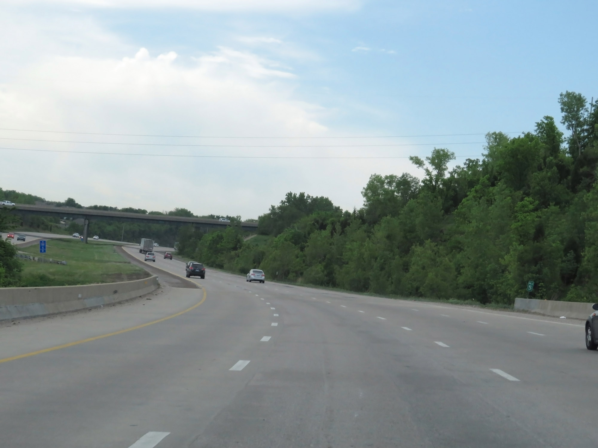 Interstate 435 Outer Loop (South) at mile marker 1.2, as it begins its curve to the east. (Photo taken 5/17/18). |