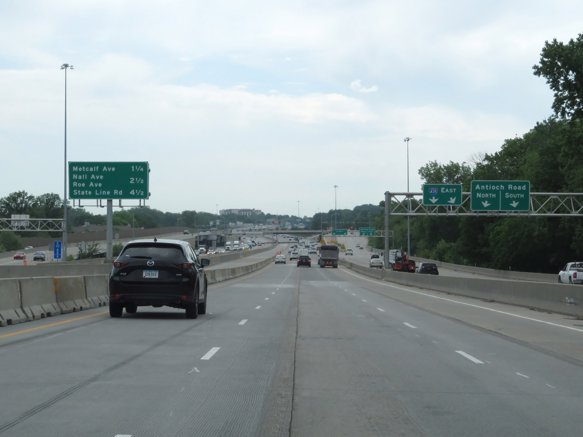 Interstate 435 Outer Loop (East) at Exit 77A: Roe Ave; Exit 77B: Nall Ave (Photo taken 5/17/18). |