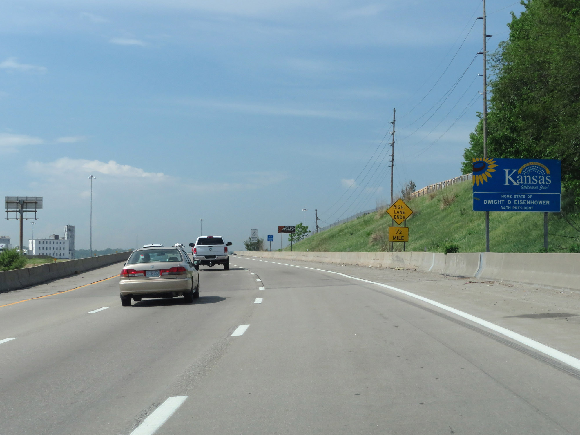 Kansas welcome sign, nearing the western terminus of Interstate 670. (Photo taken 5/17/18). |