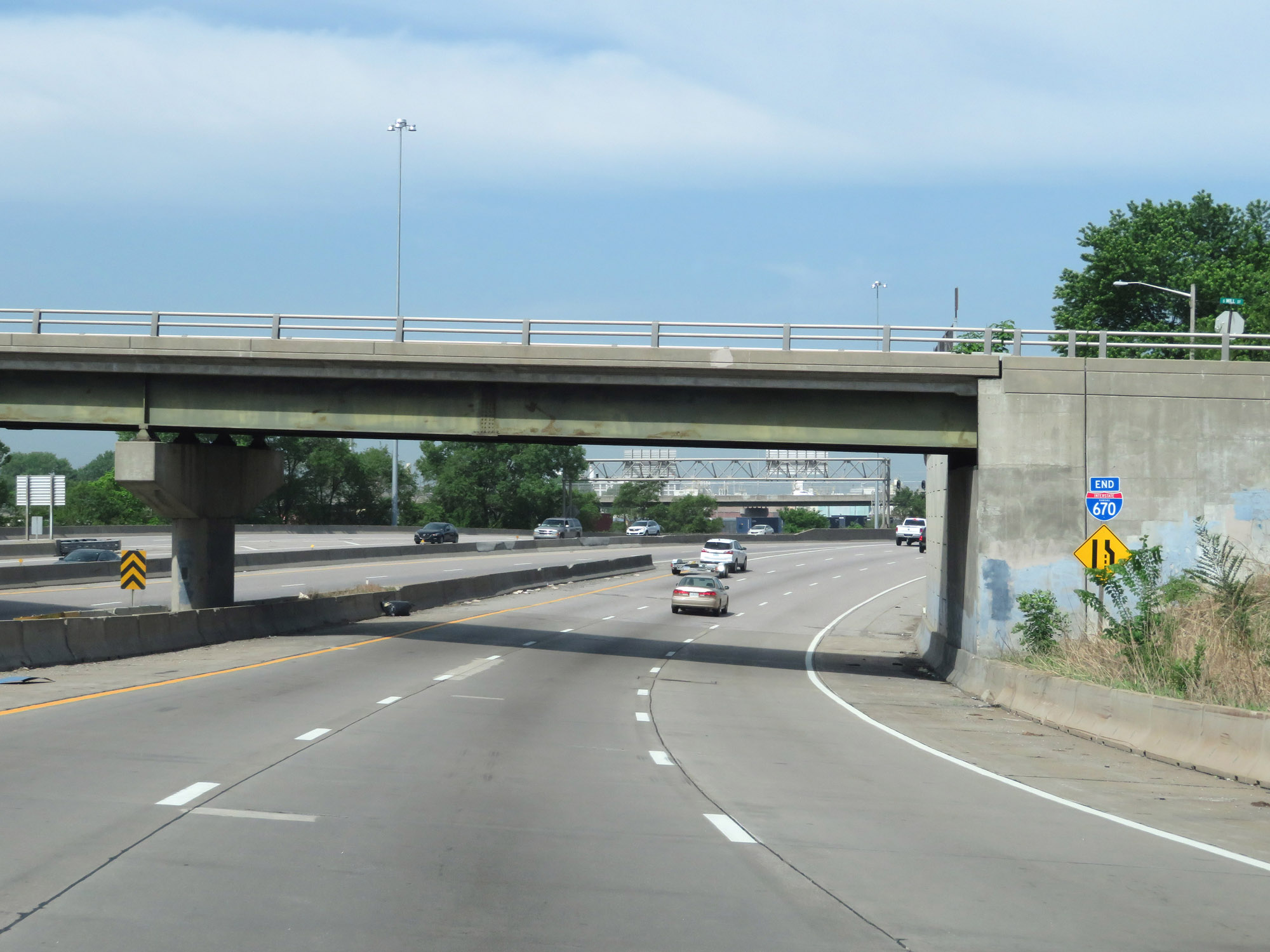 Interstate 670 END shield as it prepares to merge into Interstate 70 West ahead. (Photo taken 5/17/18). |