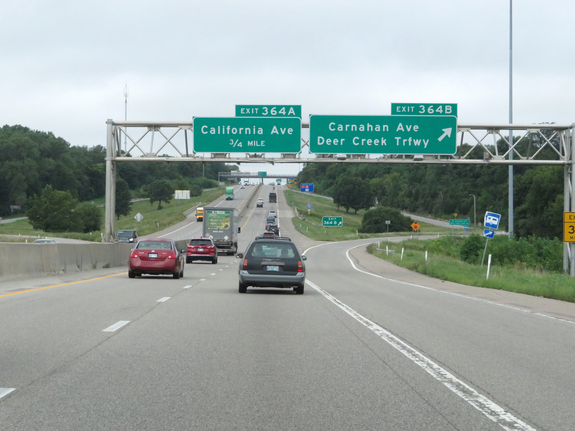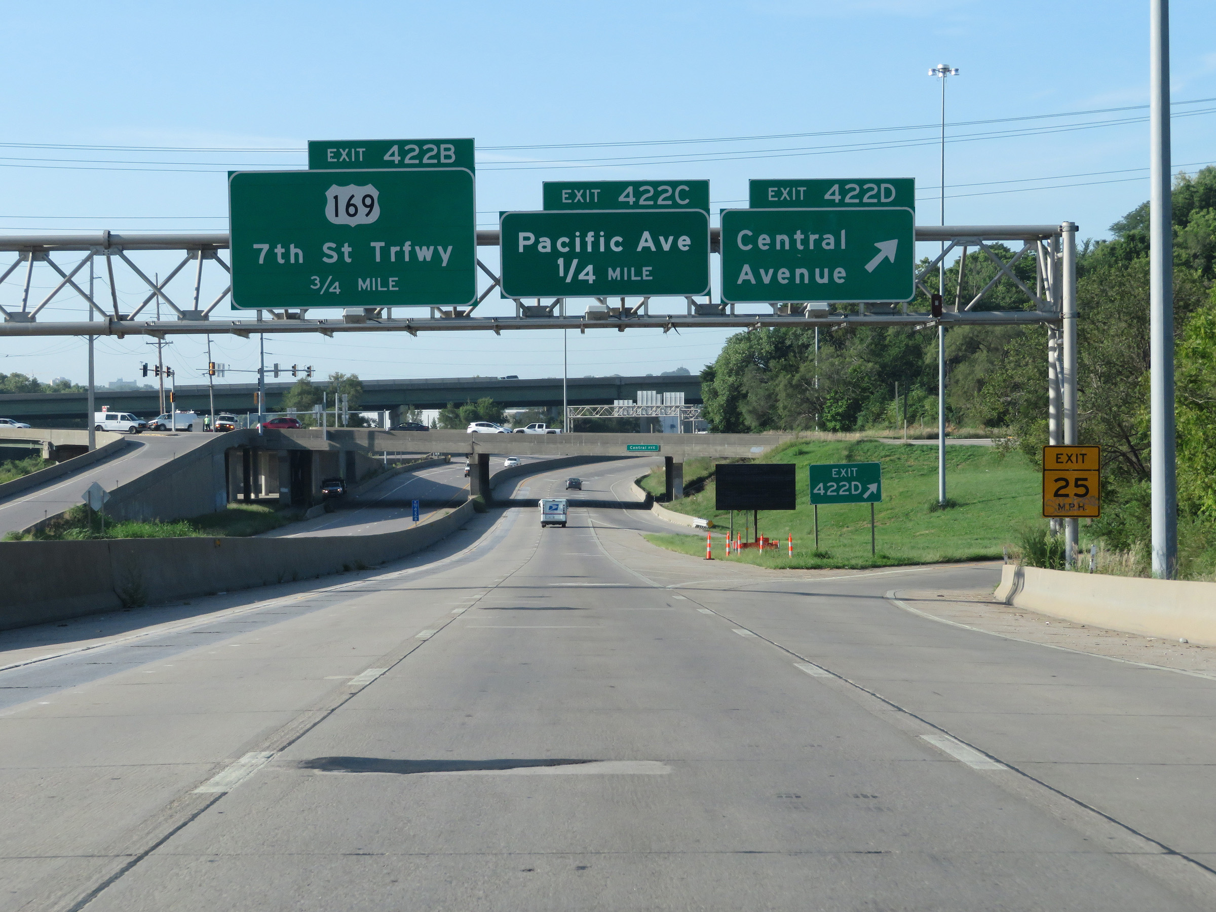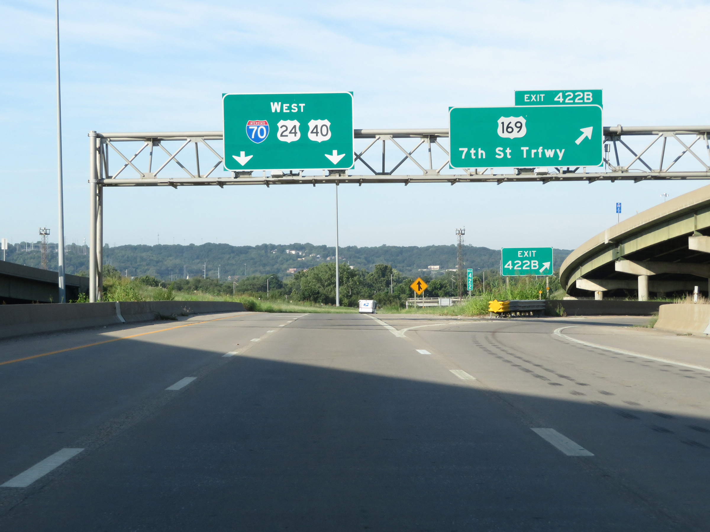 Interstate 70 West at Exit 422B: US 169 - 7th St Trafficway (Photo taken 8/12/20). |