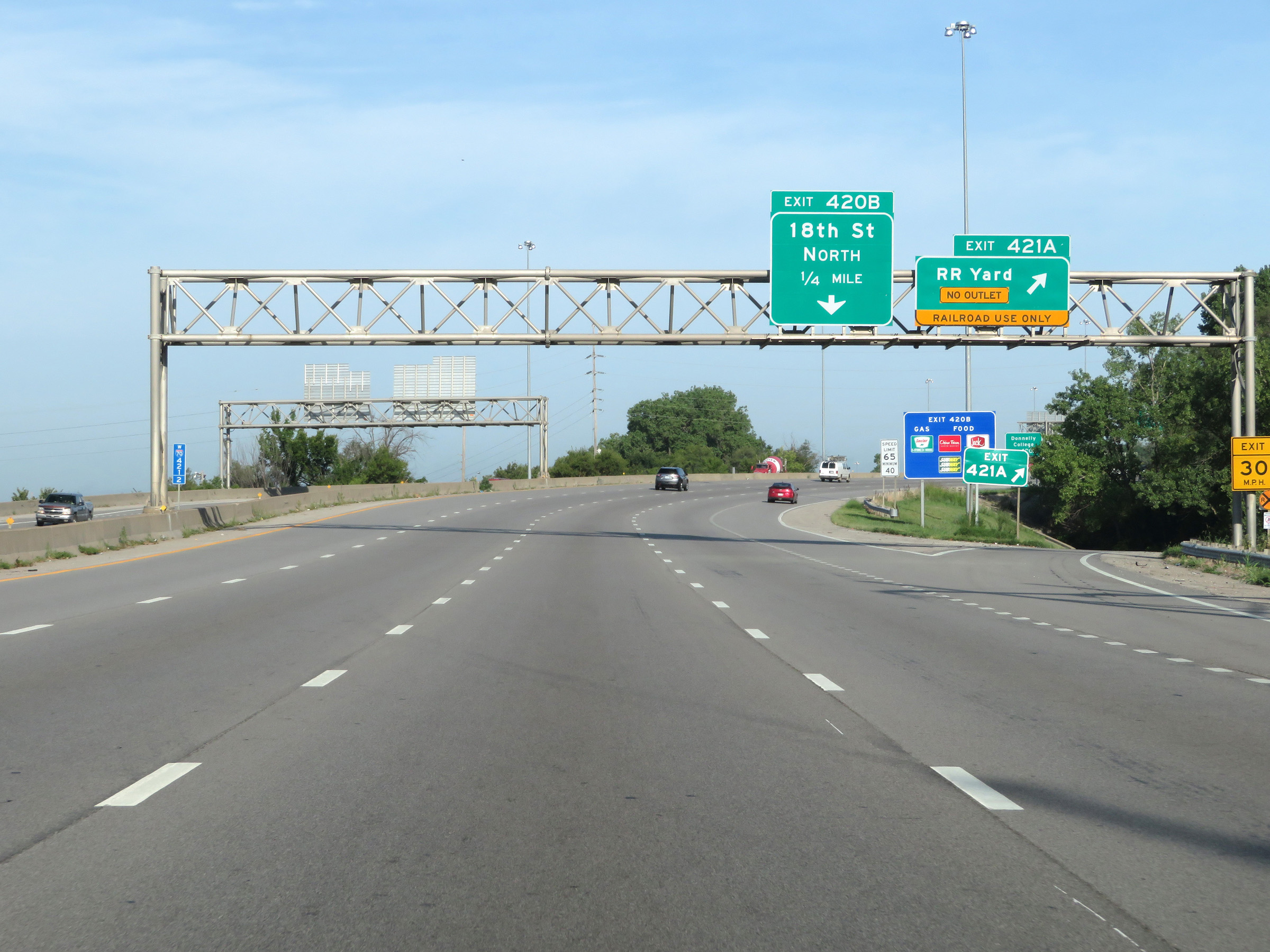 Interstate 70 West at Exit 420A: US 69 South - 18th St Expwy (Photo taken 8/12/20). |