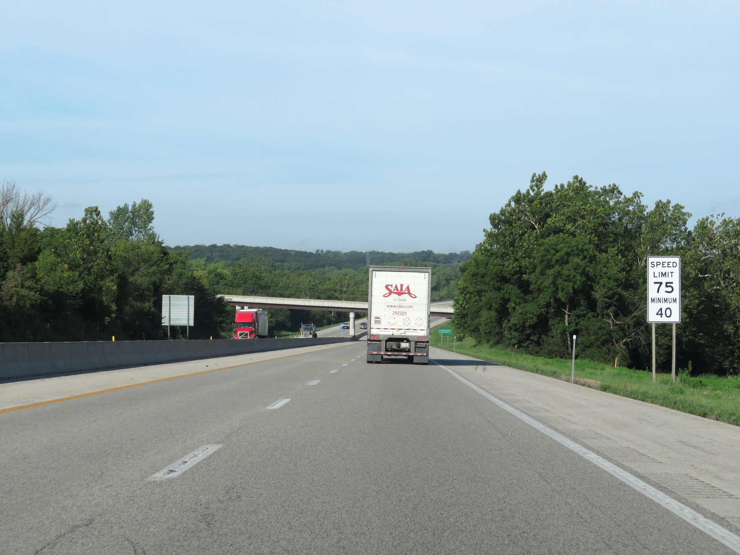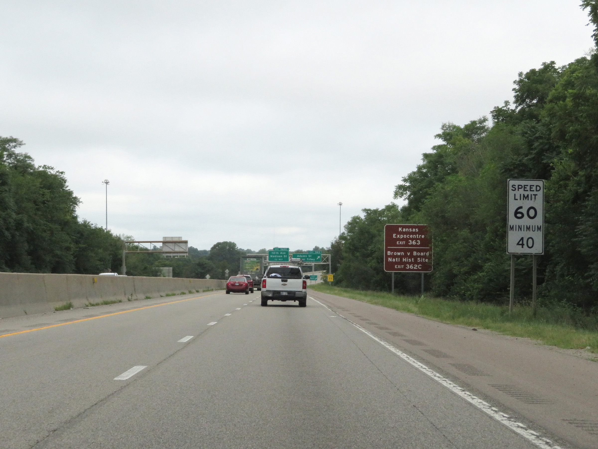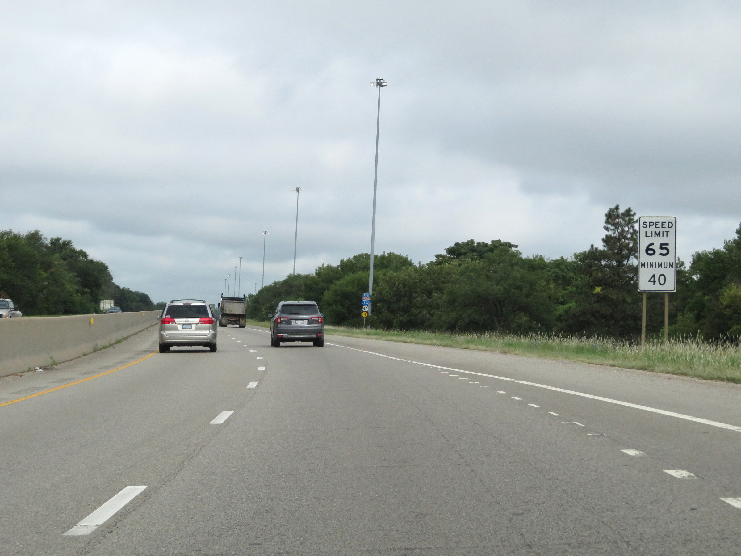 The speed limits on Interstate 70 West in Kansas start out at 55 mph maximum and 40 mph minimum through the Kansas City area. (Photo taken 8/12/20). |