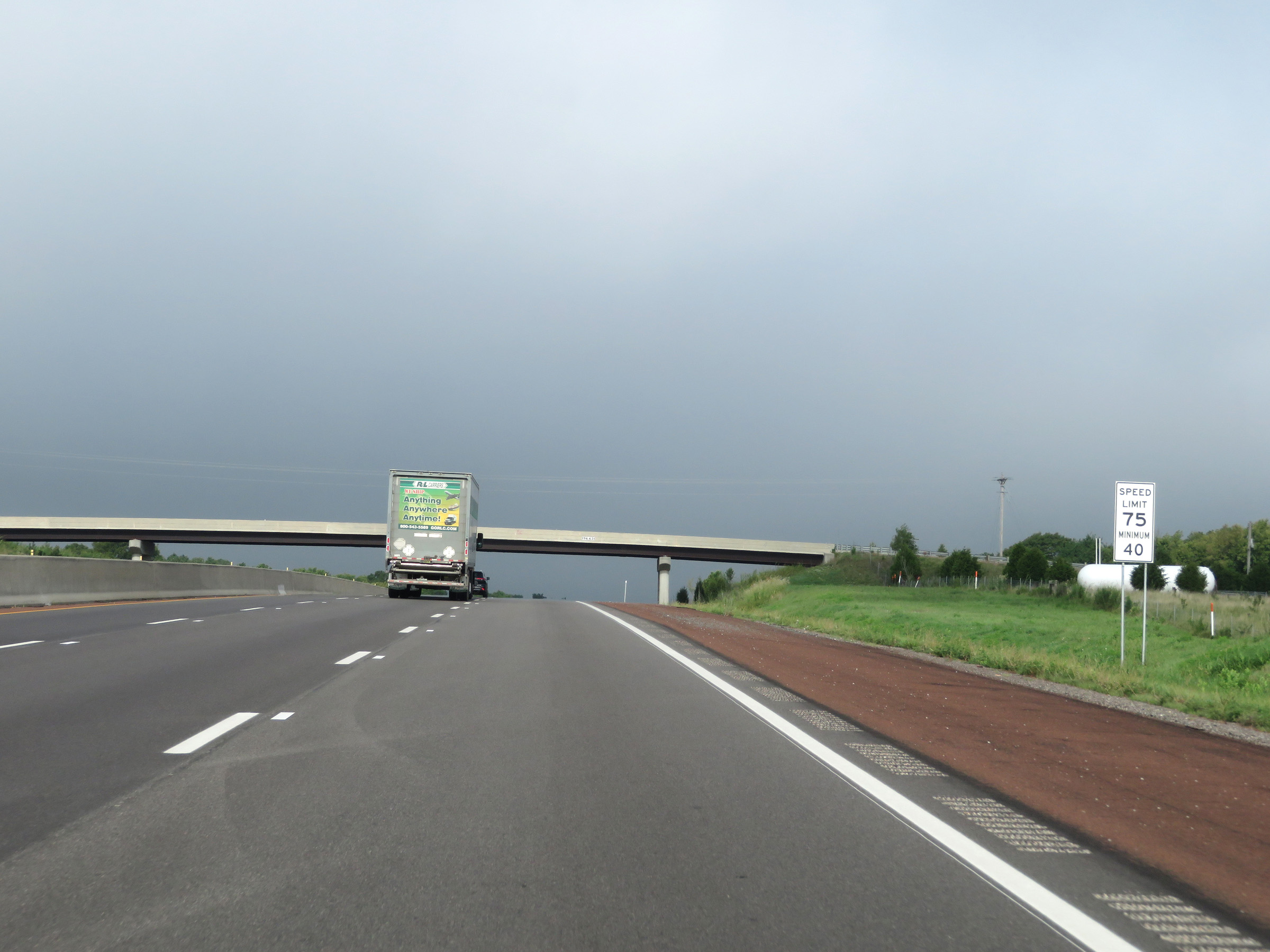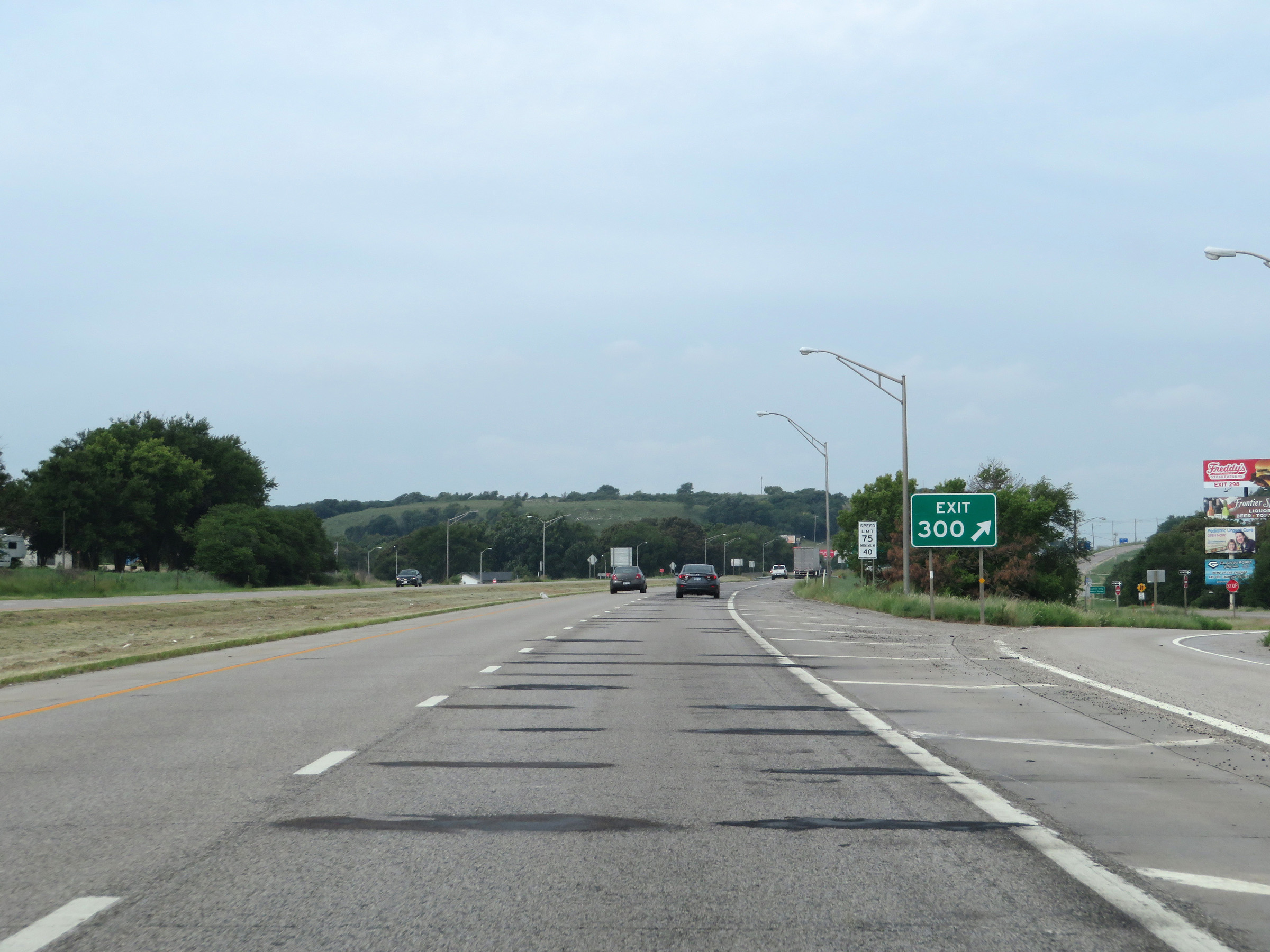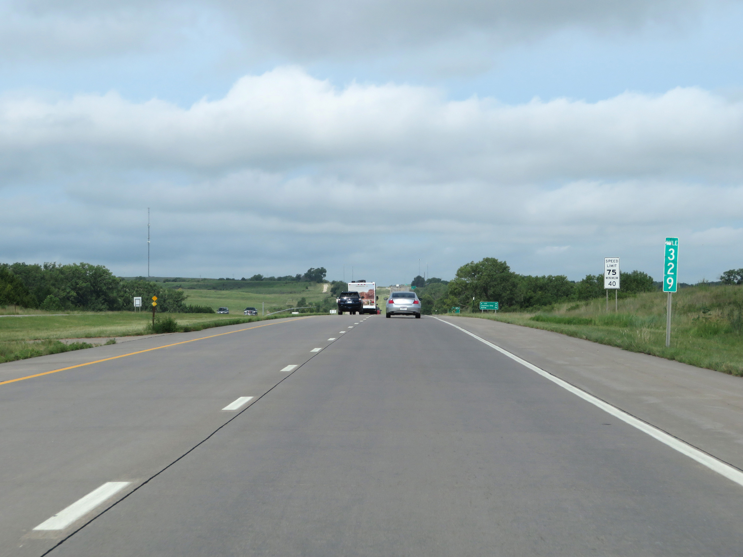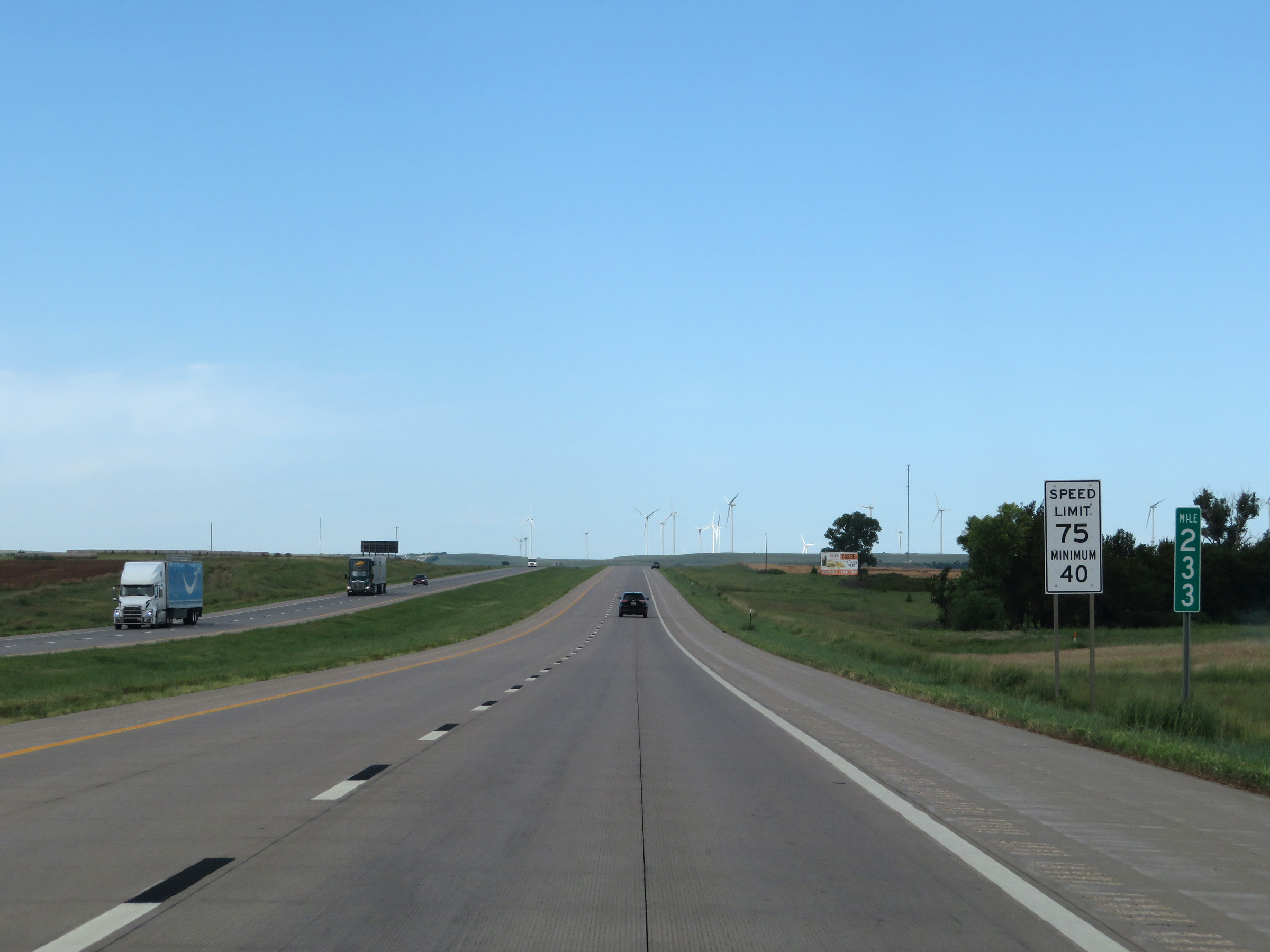 West of Exit 224A, the maximum speed limit increases to 75 mph. The minimum speed limit remains 40 mph. These are the standard speed limits on most rural Interstate highways in Kansas. (Photo taken 8/12/20). |