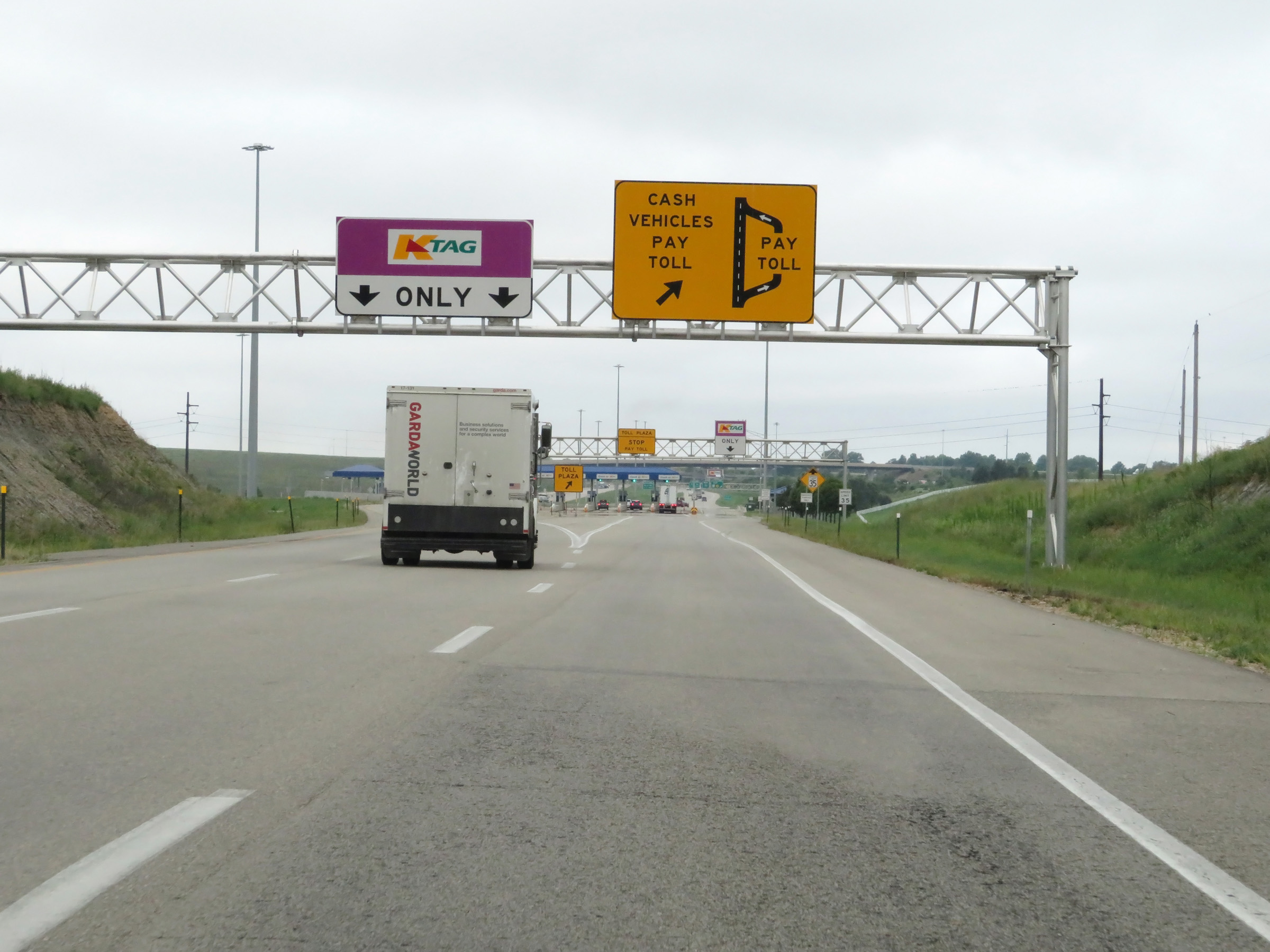 Interstate 70 West (Kansas Turnpike) at the ramp to the Eastern Terminal Toll Plaza. Cash customers must exit off here to take a ticket at the toll plaza. K Tag holders can remain on the mainline and pay electronically by passing under the toll gantry ahead. (Photo taken 8/12/20). |