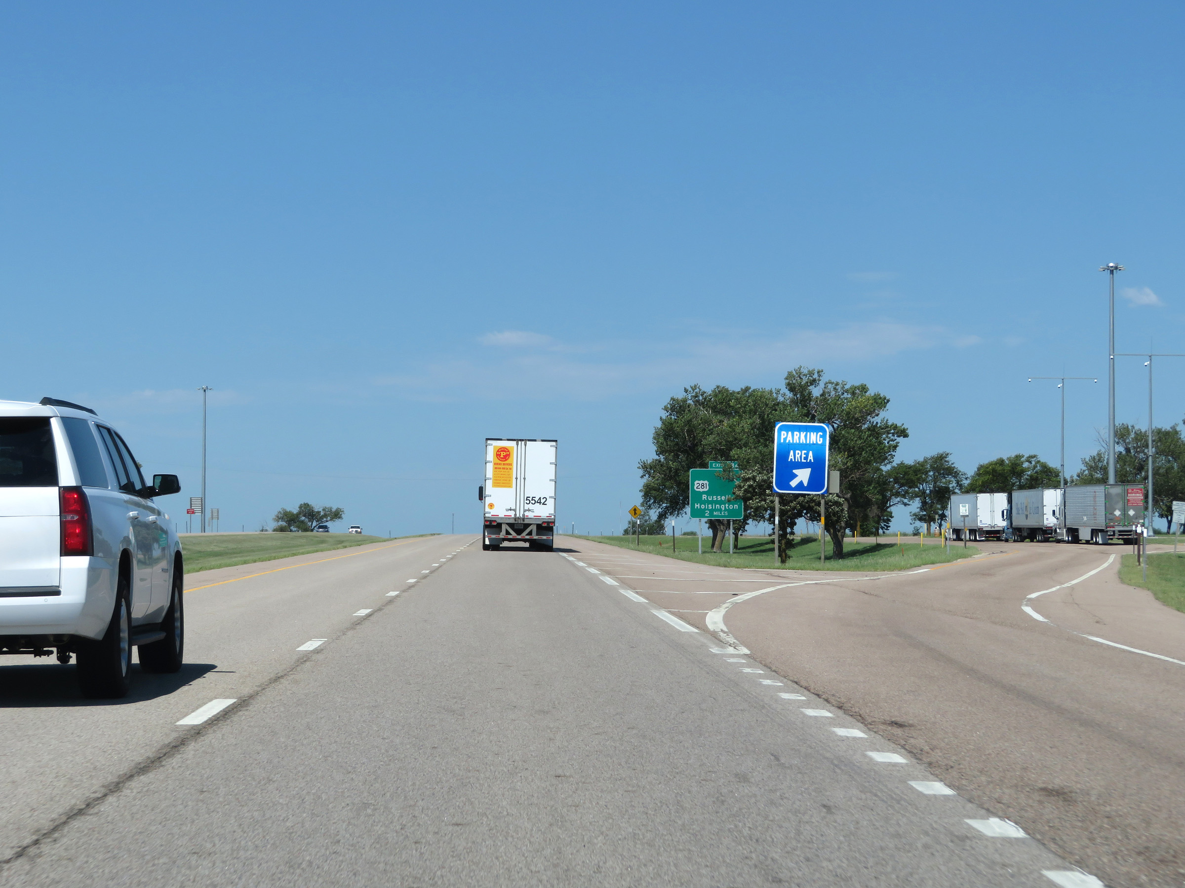 There are two service areas on the Interstate 70 portion of the Kansas Turnpike. This sign shows the distances to them and dynamically displays the number of currently available truck parking spaces. (Photo taken 8/12/20). |