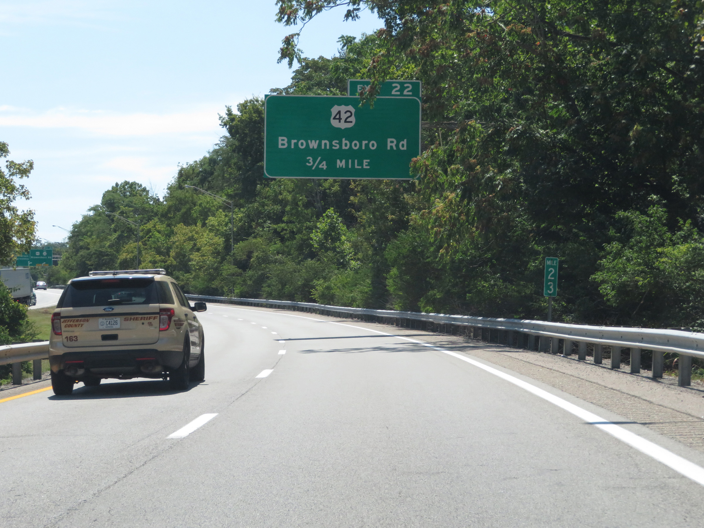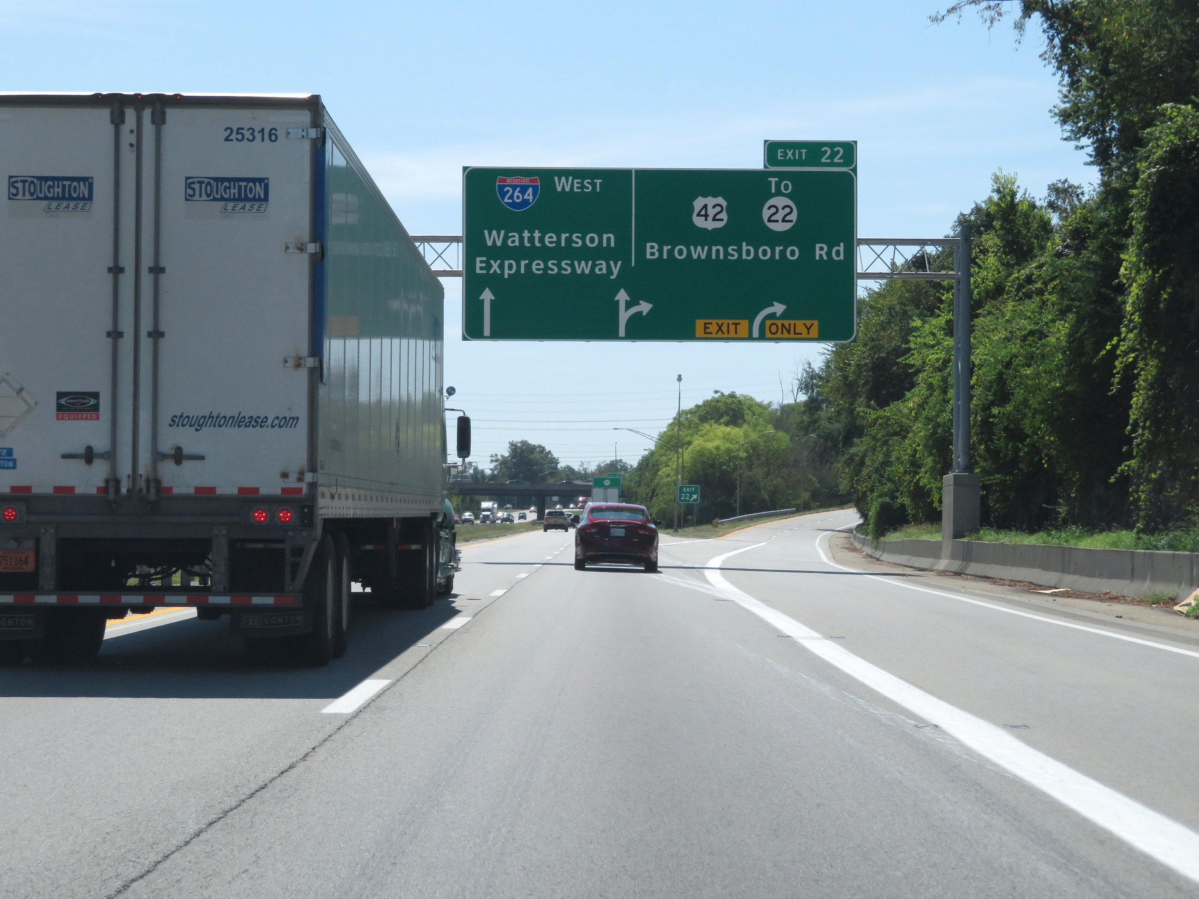 Interstate 264 West at Exit 22: US 42 / To KY 22 - Brownsboro Rd (Photo taken 8/10/19). |