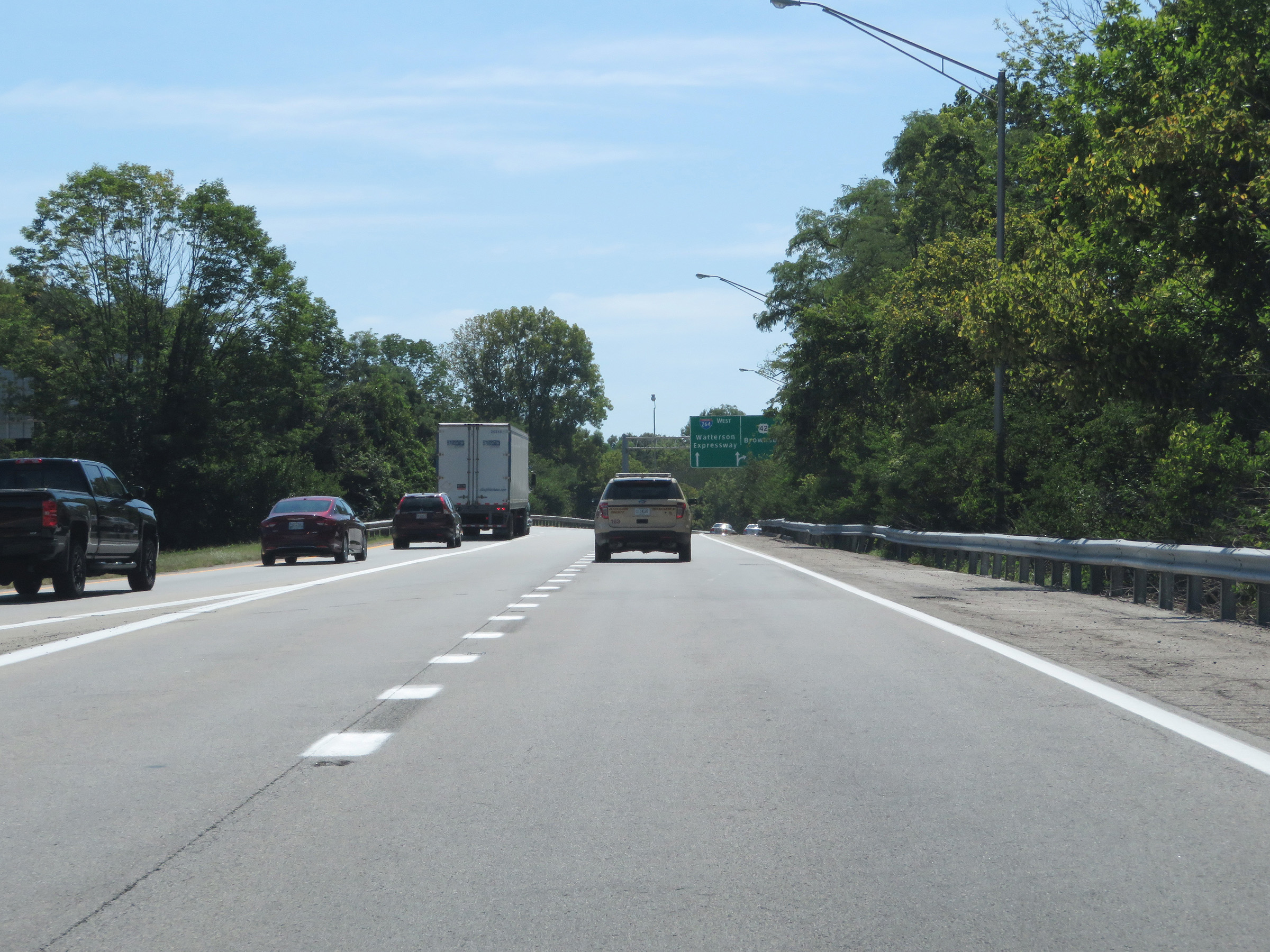 Approaching the junction of Interstate 64 via Exits 0A-B, and the western terminus of Interstate 264, the left lane comes to an end. Traffic to I-64 West should use the current center lane (left lane ahead) and traffic to I-64 East should use the right lane. (Photo taken 8/10/19). |