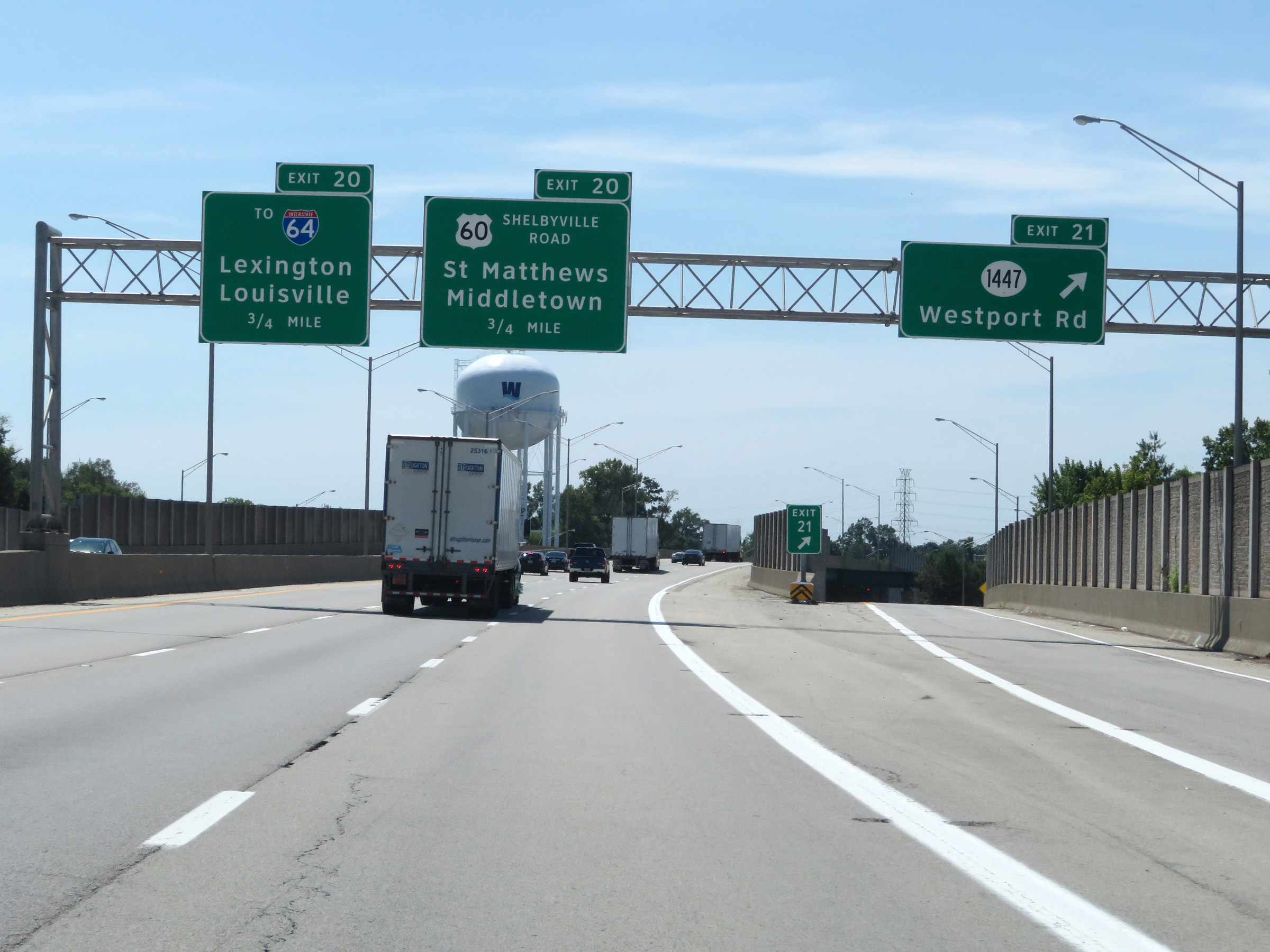 Interstate 264 West at Exit 21: KY 1447 - Westport Rd (Photo taken 8/10/19). |