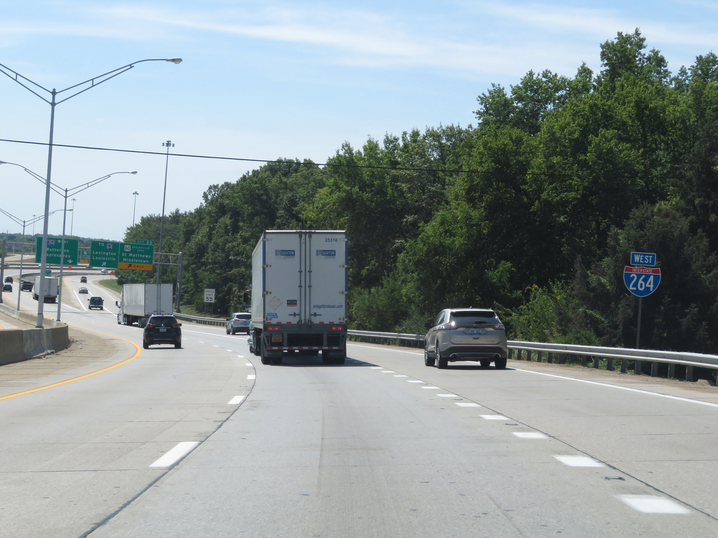Interstate 264 West at Exit 19B: Interstate 64 West - Louisville (Photo taken 8/10/19). |