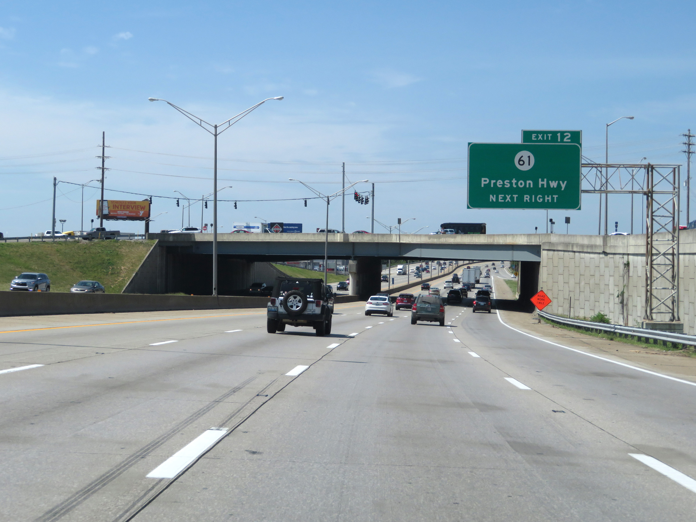 Take Exit 12 to KY 61 (Preston Hwy). It is accessible from the collector/distributor road which also serves the ramps to Interstate 65. (Photo taken 8/10/19). |