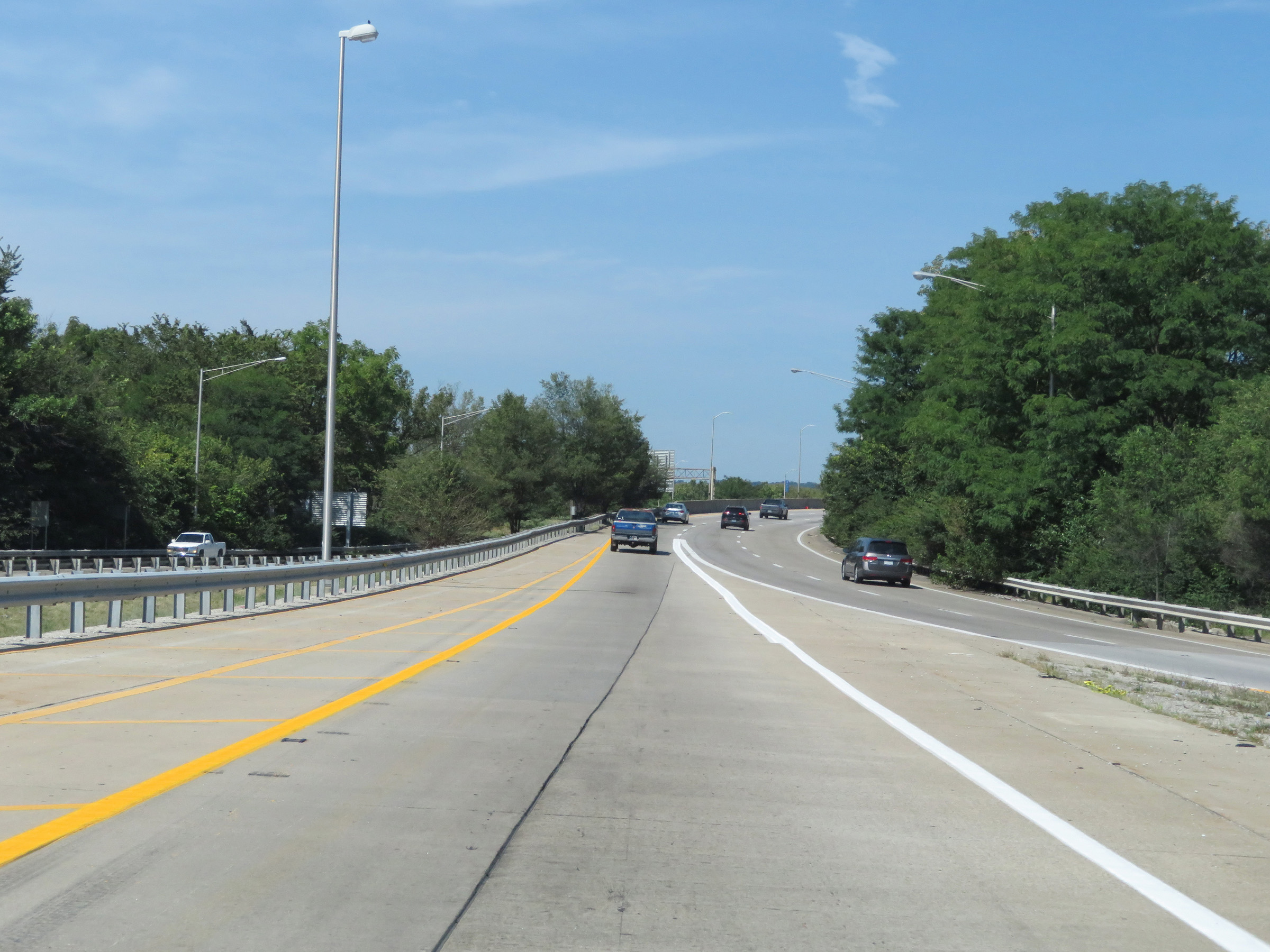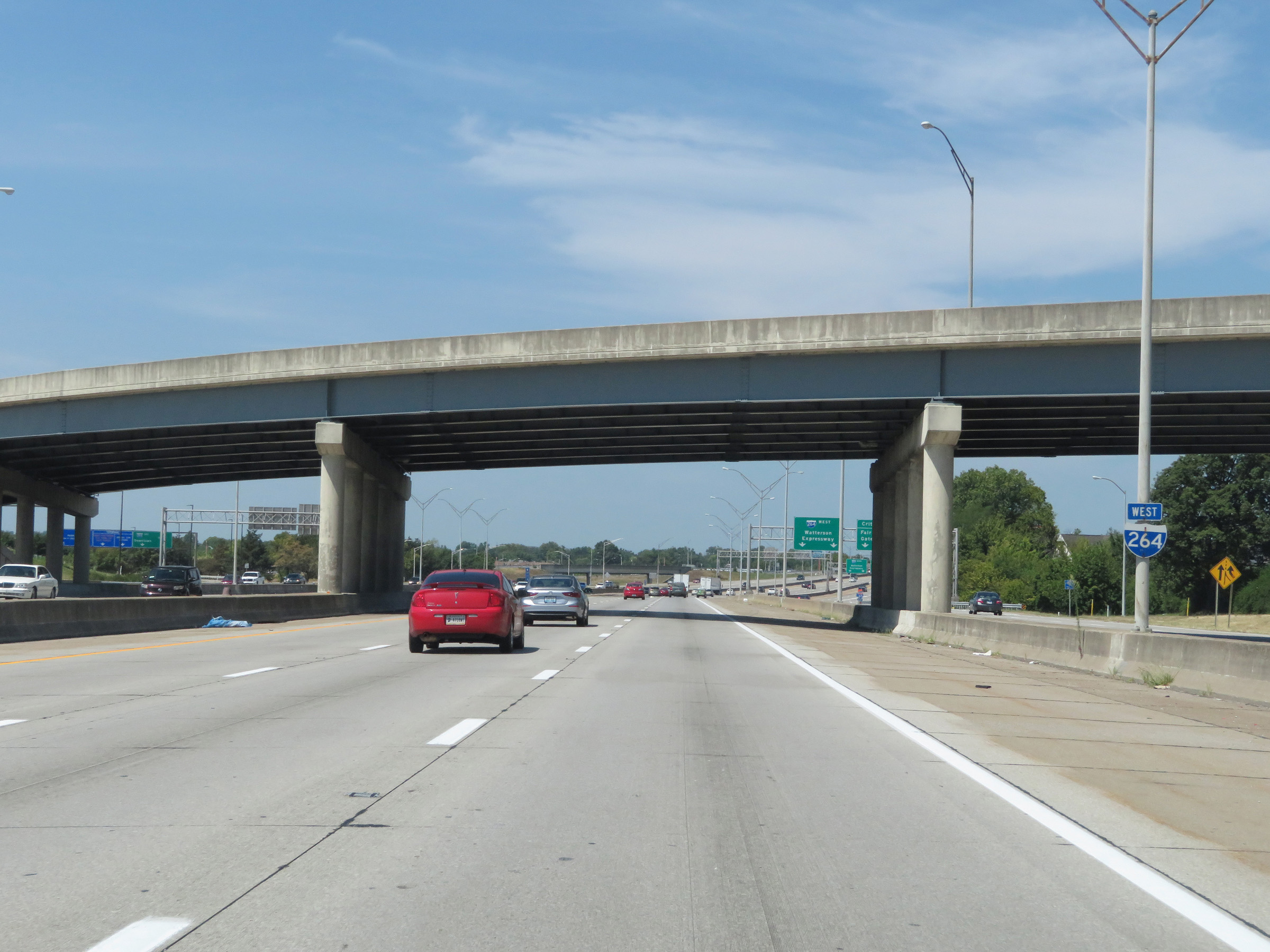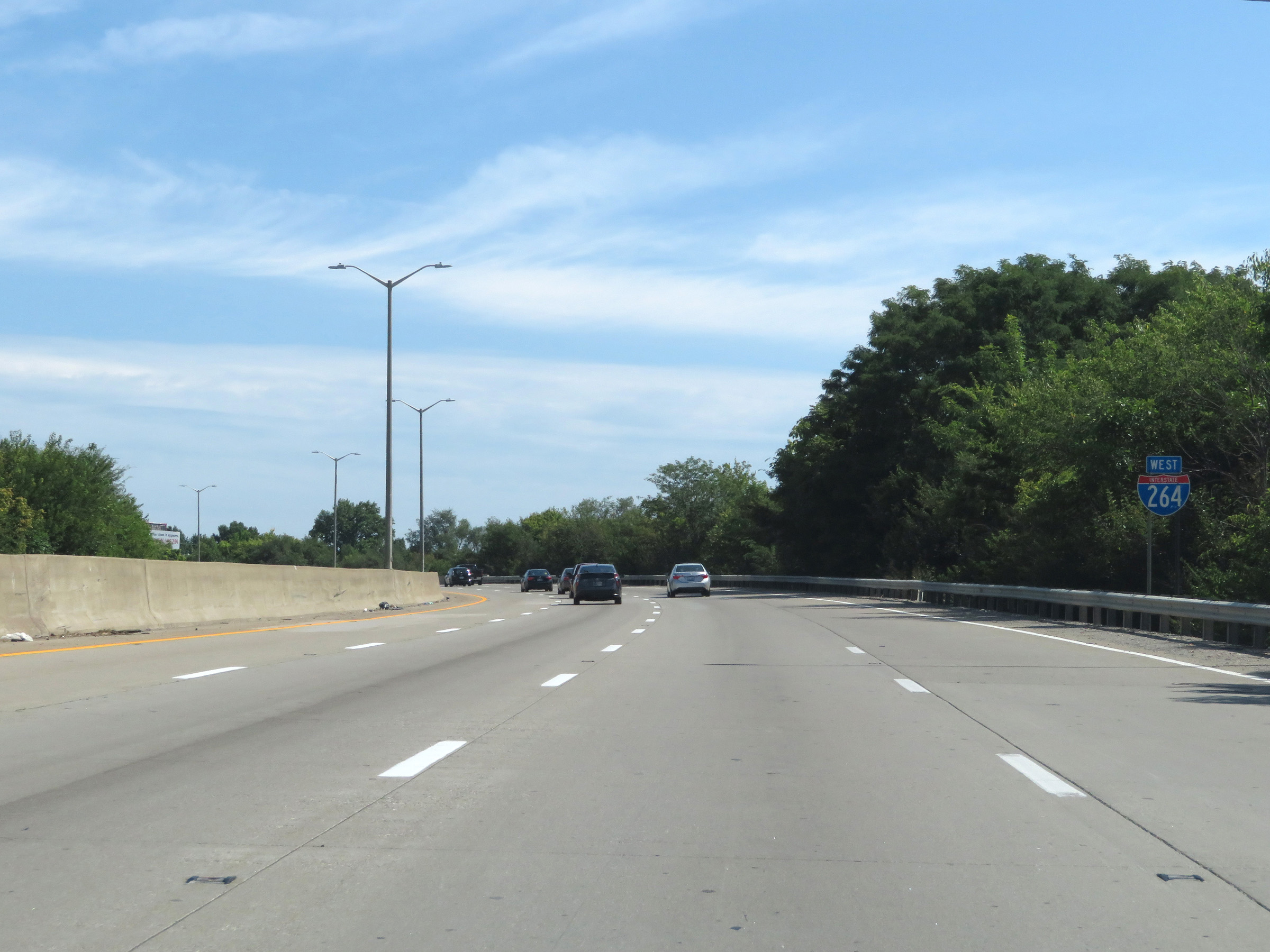 View on Interstate 264 West at mile marker 0.4, approaching the junction of Interstate 64 and the western terminus of I-264. (Photo taken 8/10/19). |