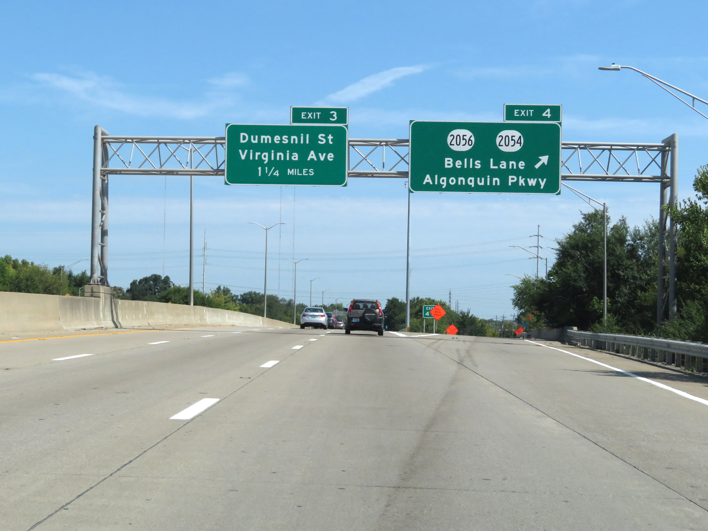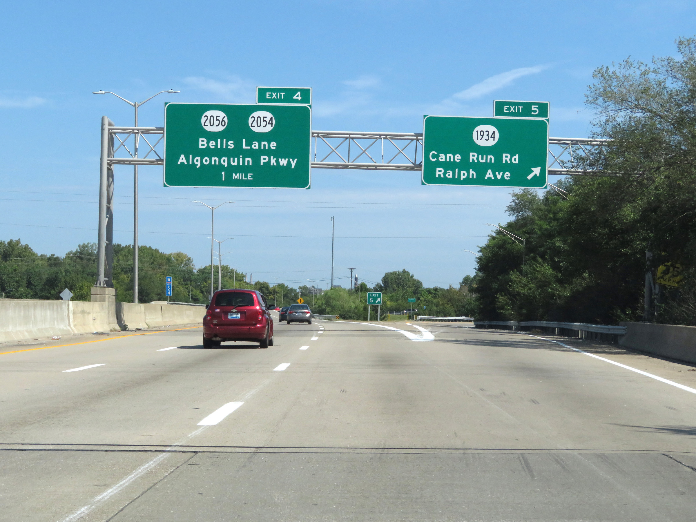 Interstate 264 West at Exit 4: KY 2056 / KY 2054 - Bells Lane / Algonquin Pkwy (Photo taken 8/10/19). |