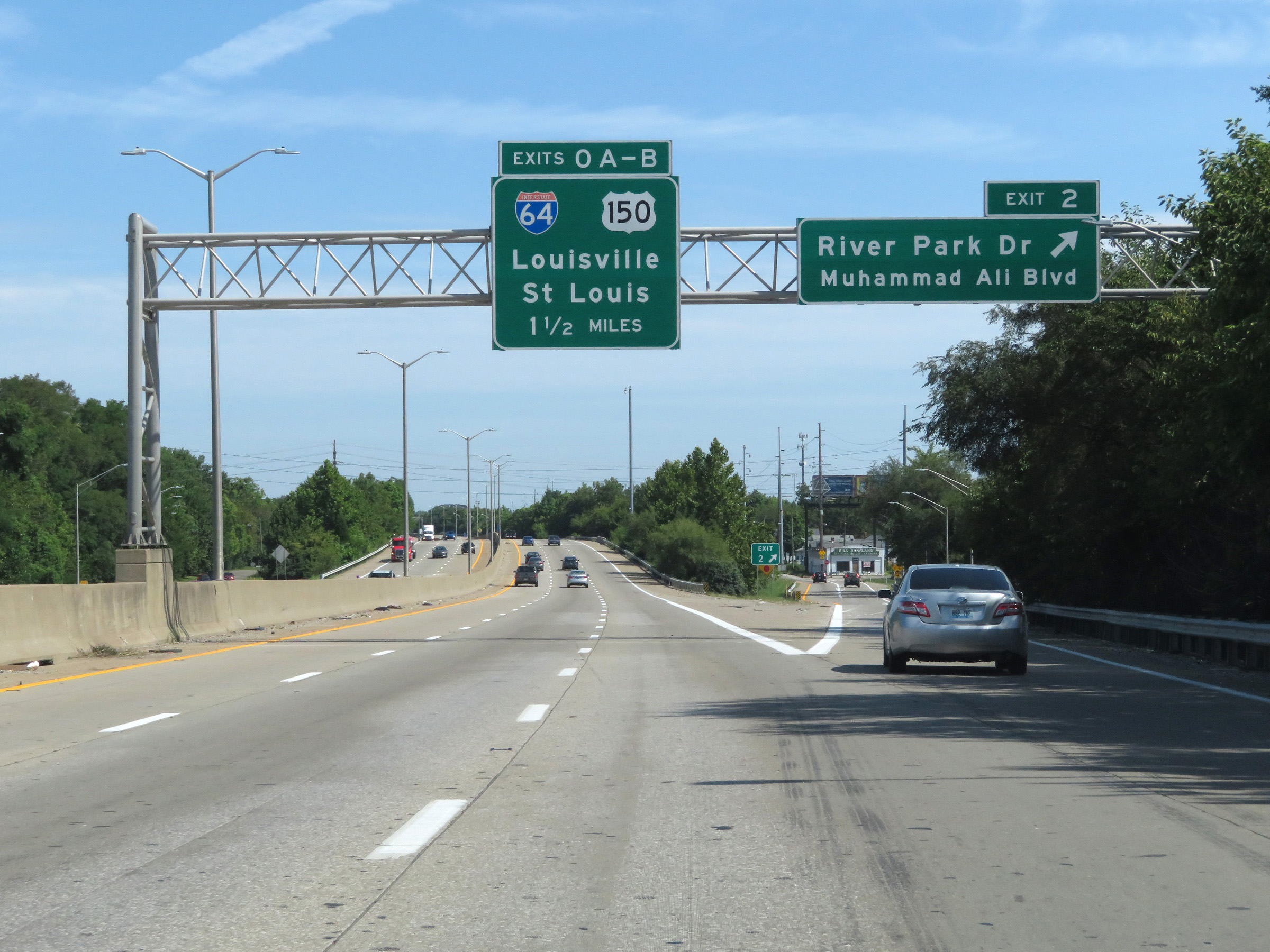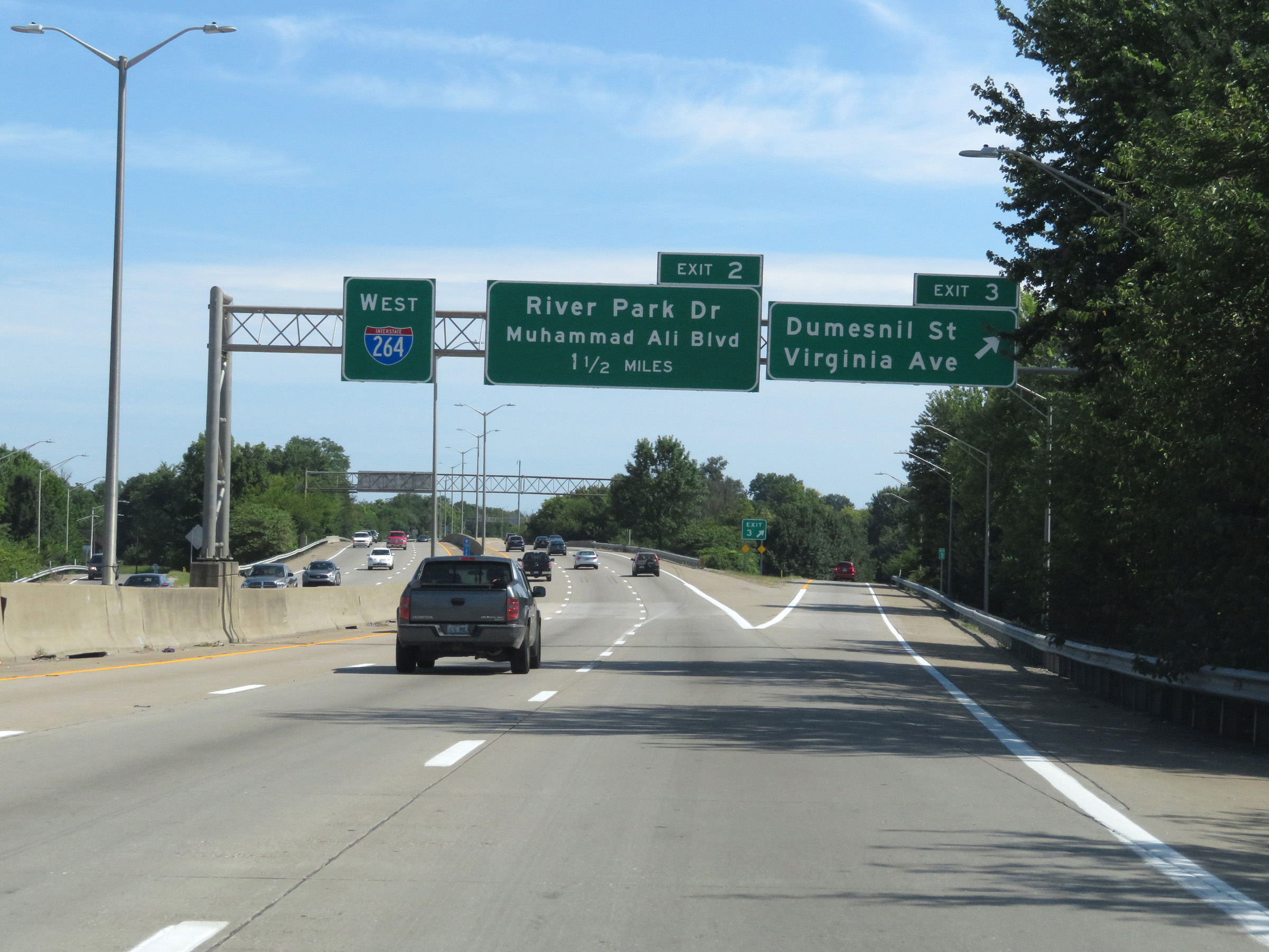 Interstate 264 West at Exit 2: River Park Dr / Muhammad Ali Blvd (Photo taken 8/10/19). |