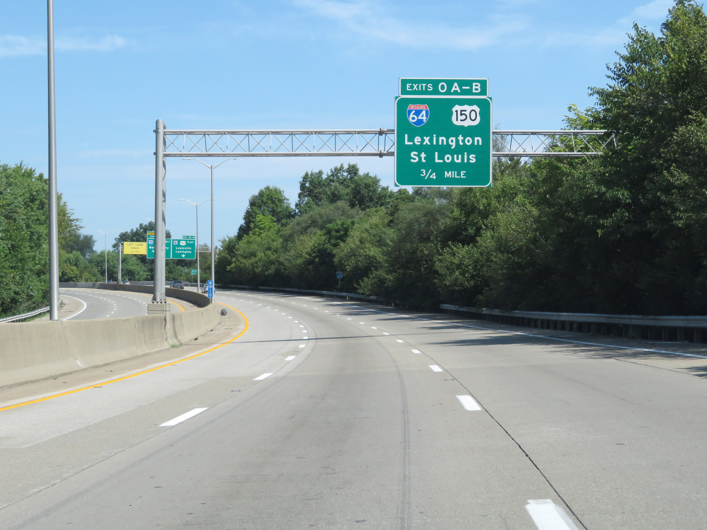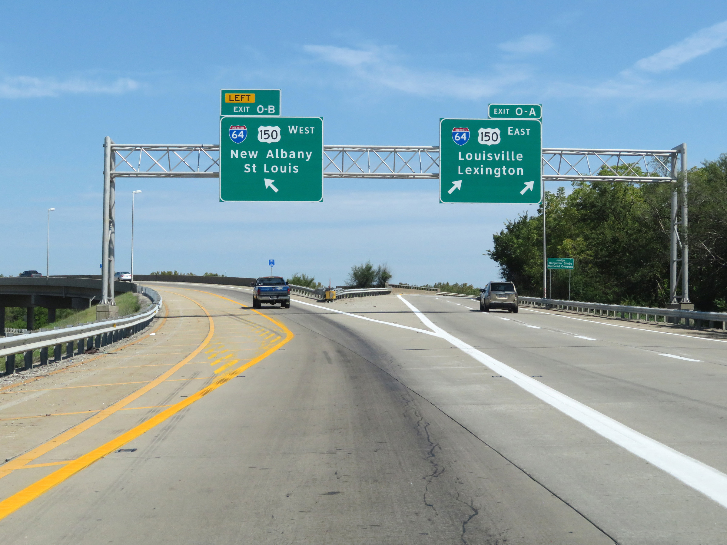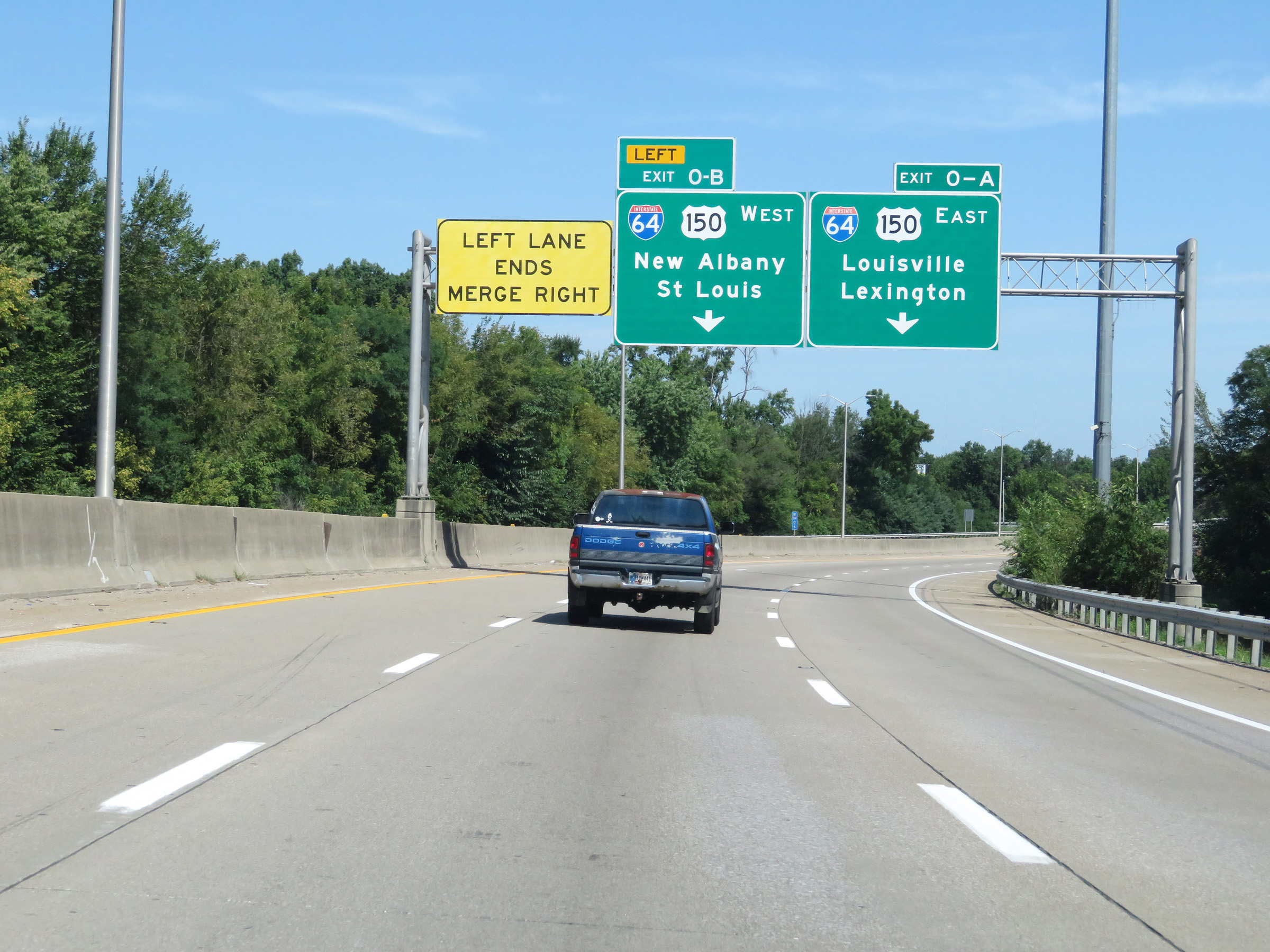 Interstate 264 West at Exit 0A: Interstate 64 East / US 150 East - Louisville / Lexington; Exit 0B: Interstate 64 West / US 150 West - New Albany / St. Louis (Photo taken 8/10/19). |