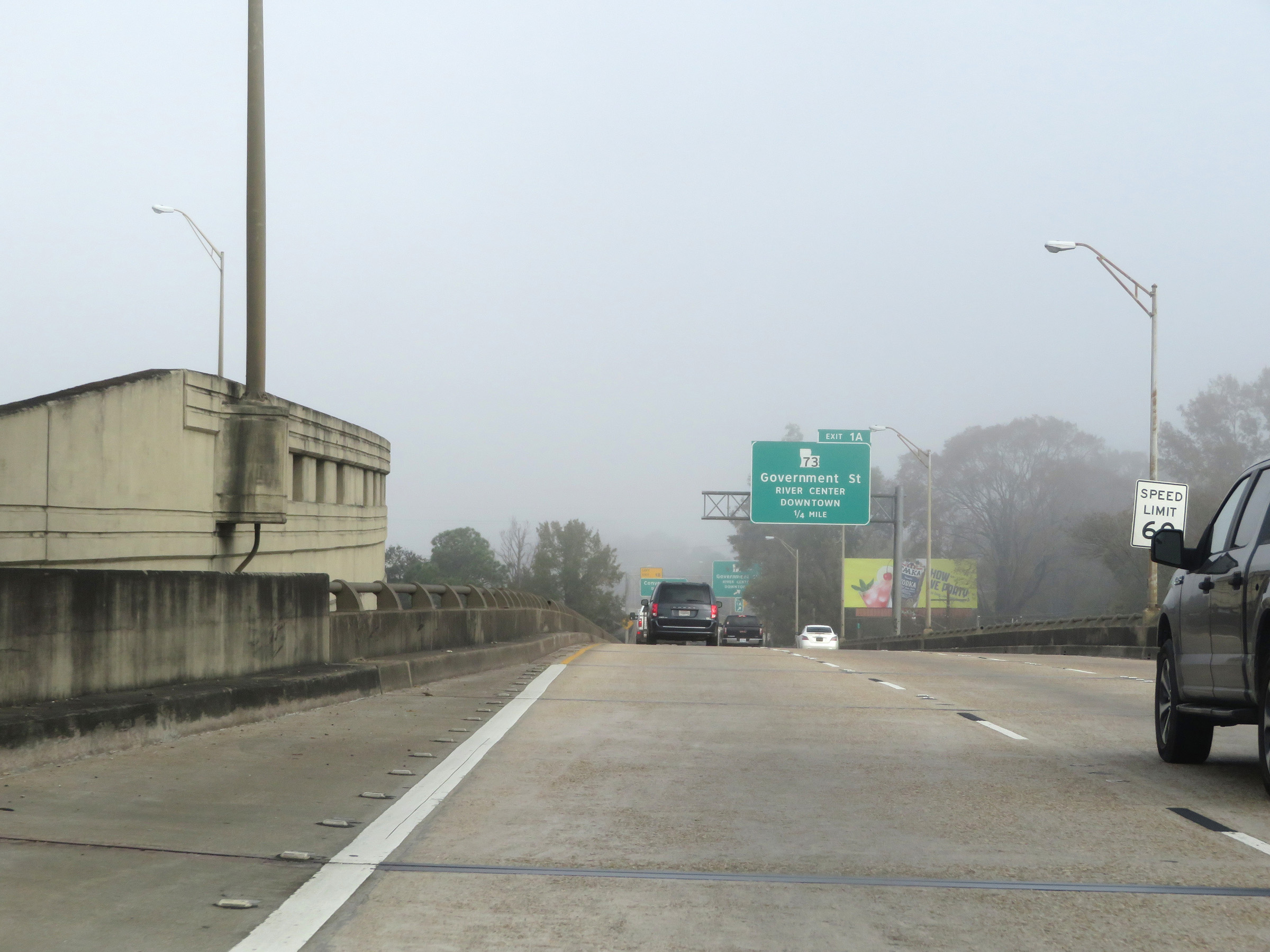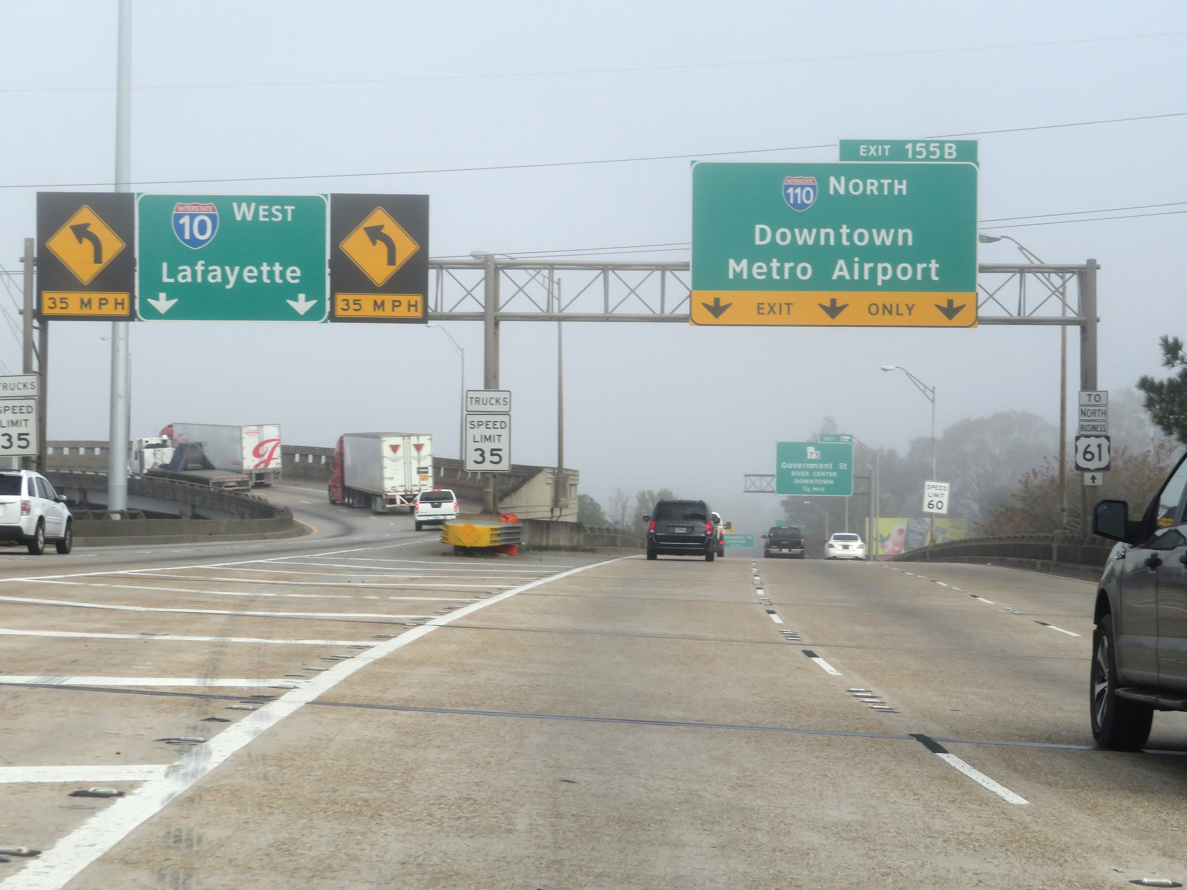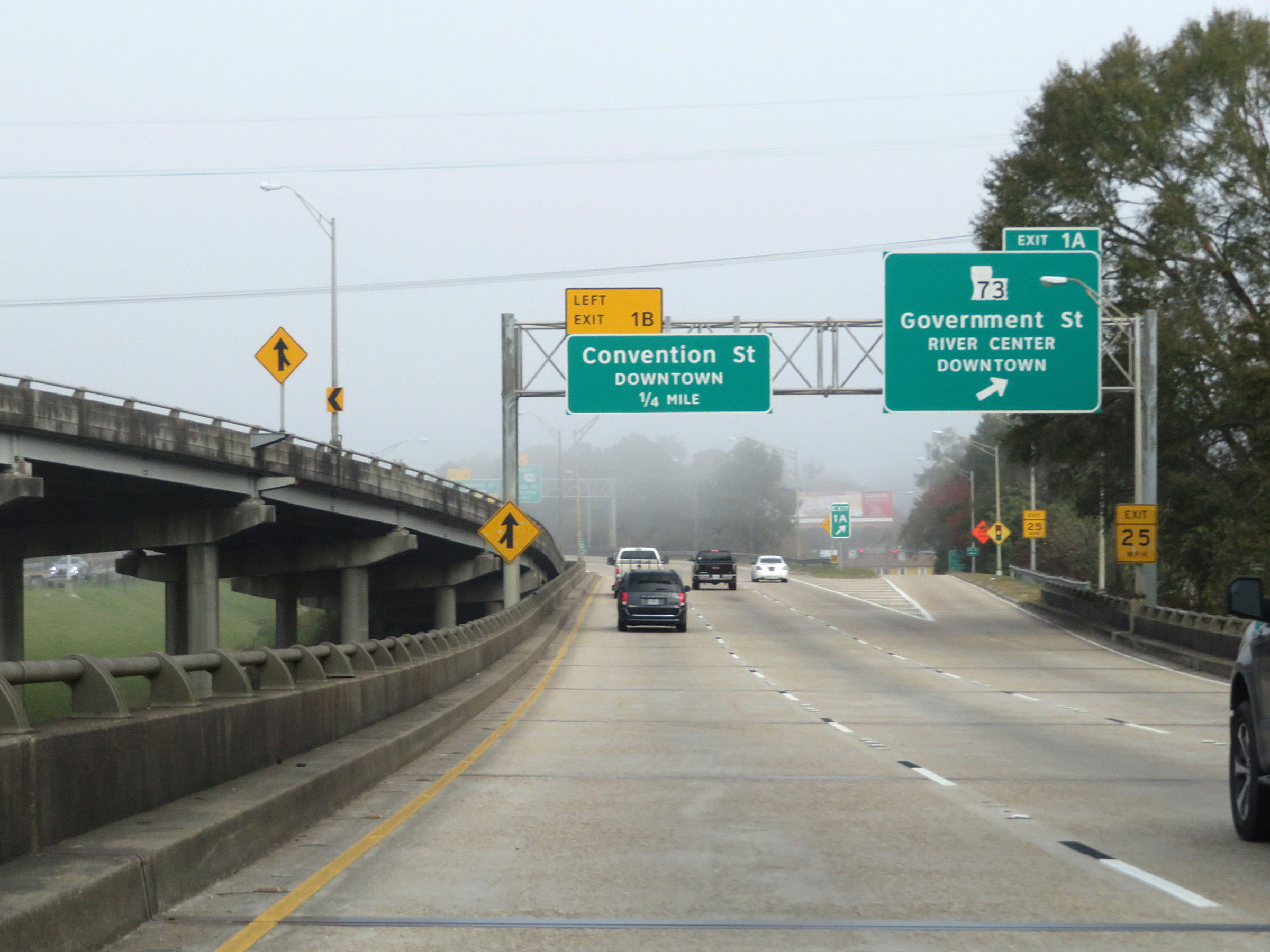 Interstate 110 North at Exit 1A: LA 73 - Government St / River Center / Downtown (Photo taken 12/10/20). |