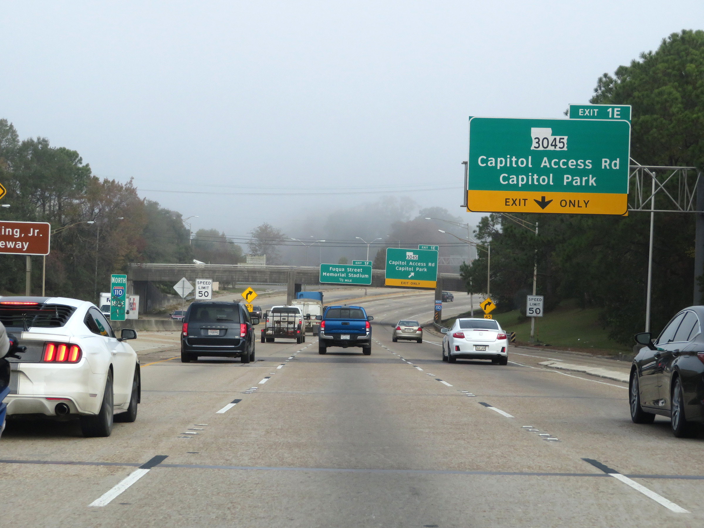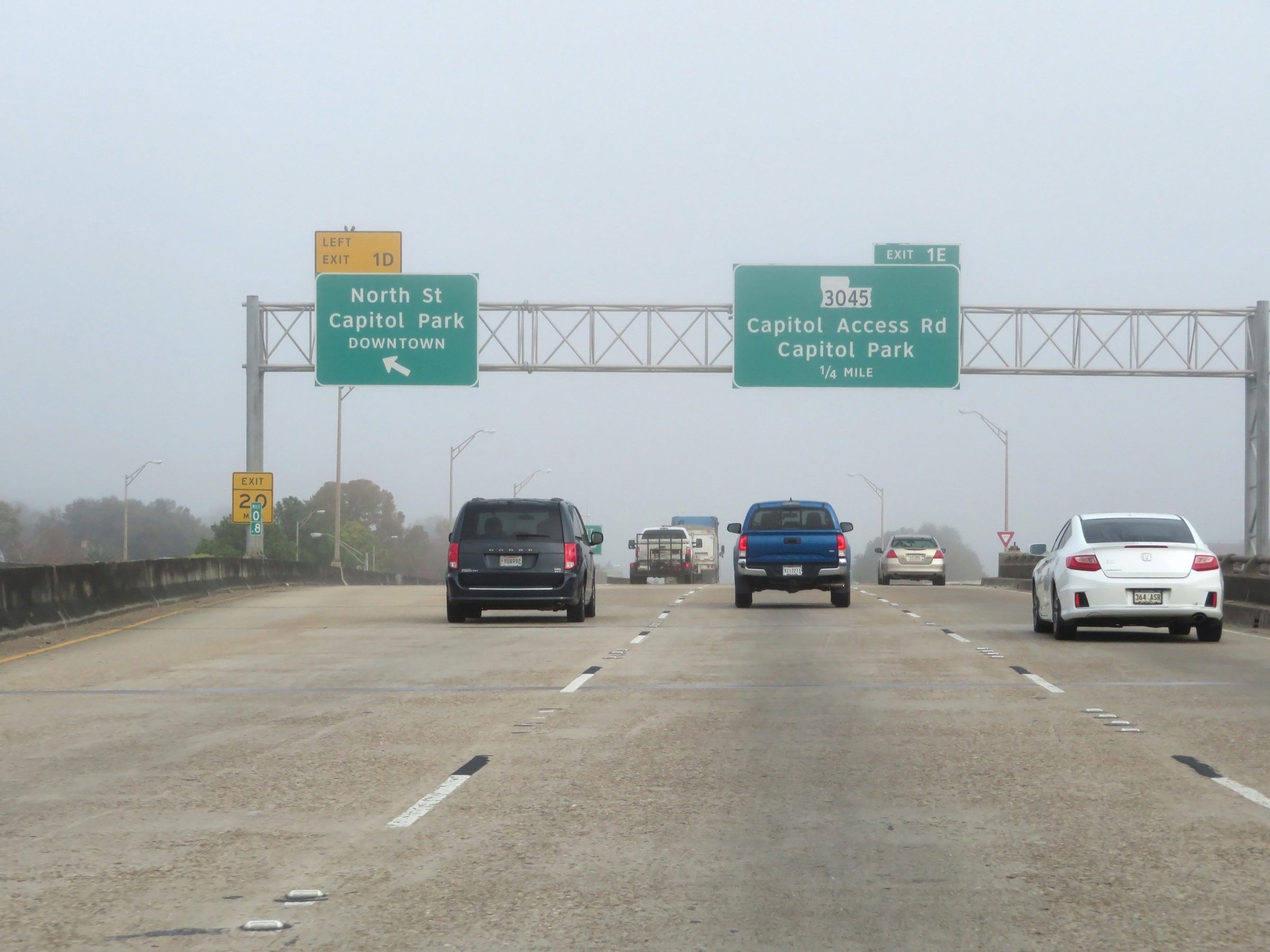 Interstate 110 North at Exit 1E: LA 3045 - Capitol Access Rd / Capitol Park (Photo taken 12/10/20). |