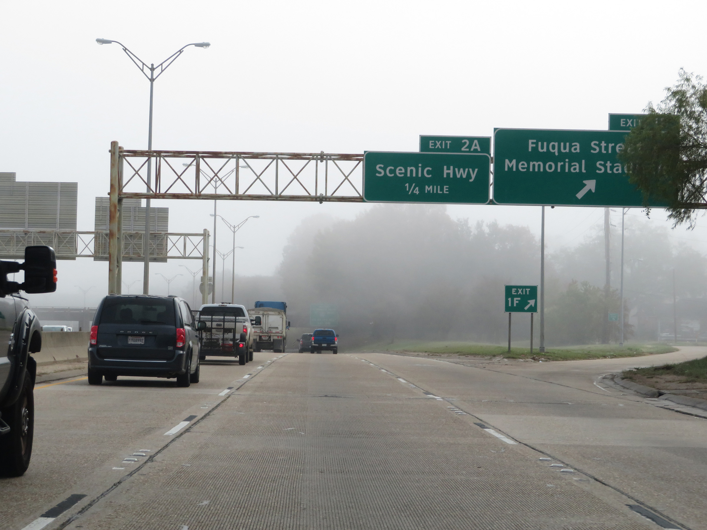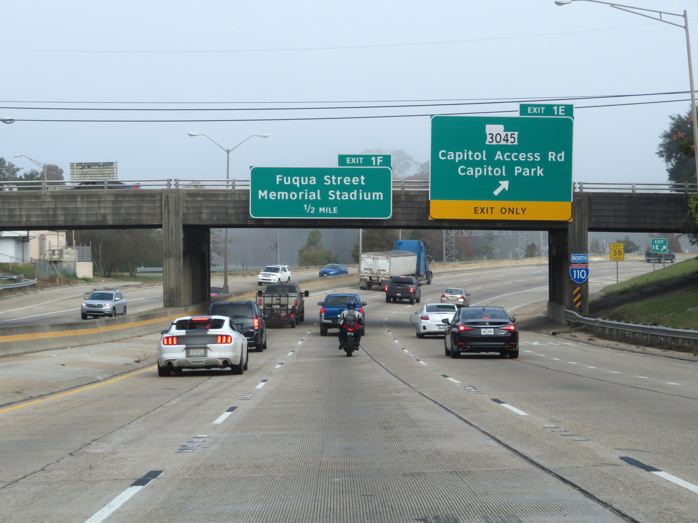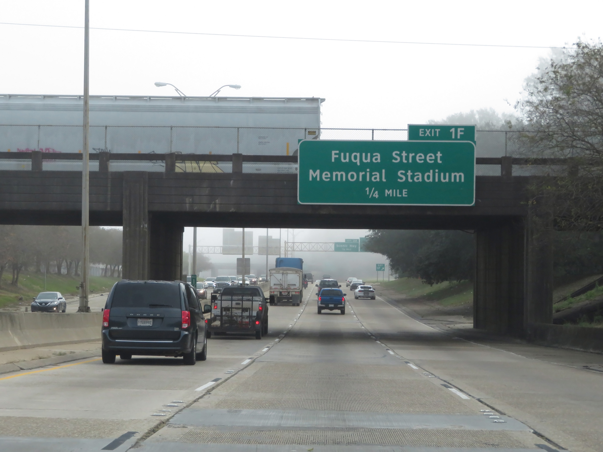 Interstate 110 North at Exit 1F: Fuqua Street / Memorial Stadium (Photo taken 12/10/20). |
